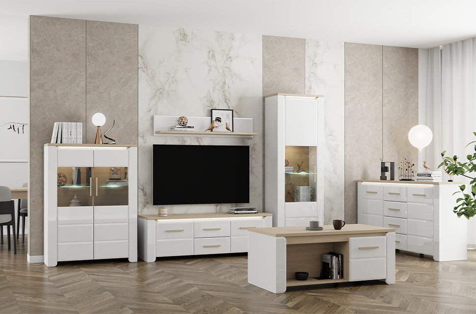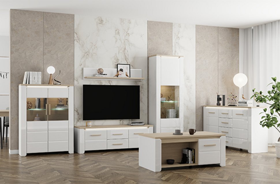 Система элементов ABERDEEN для обустройства гостиной представляет собой современное, лаконичное и исключительно функциональное решение для оформления домашнего интерьера. Сочетание матового белого декора, декора светлого портового дуба и белой лак-фольги привносит в пространство элегантность, минимализм и чётко выверенный, безупречный стиль.