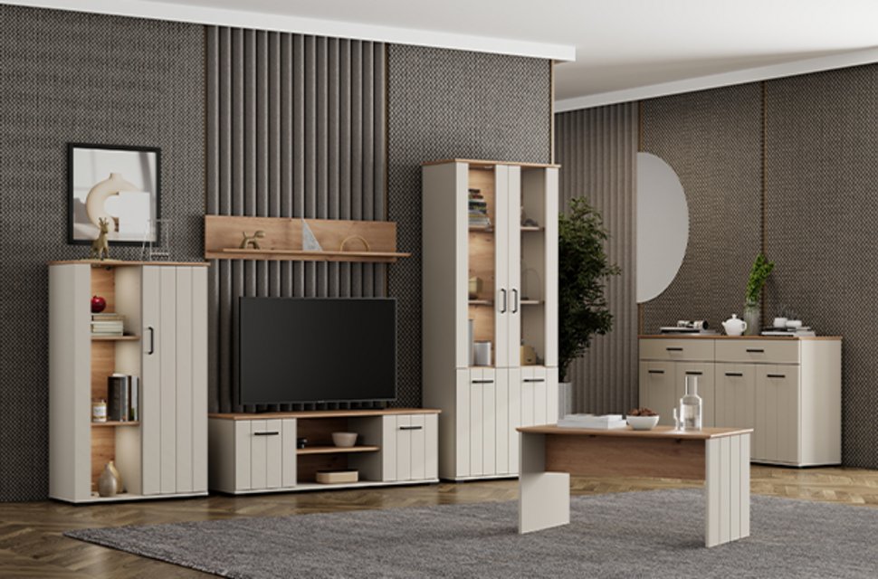 Доминирующее сочетание декора кашемира и декора ремесленного дуба привносит в интерьер теплоту, а специальная отделка в виде рельефных полос, нанесённых на фронты, придаёт рустикальный характер и дополнительно подчёркивает стилистическую выразительность этой системы.