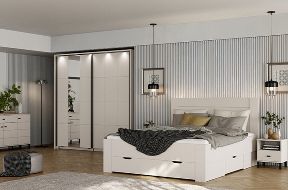 Спальня SALAMIS отличается сдержанным современным дизайном, в котором акцент сделан на чистую геометрию и функциональность. Выполненная в элегантном декоре кашемира с лаконичными чёрными ручками, эта коллекция создаёт спокойную и утончённую атмосферу, идеально подходящую для ежедневного отдыха и релаксации.