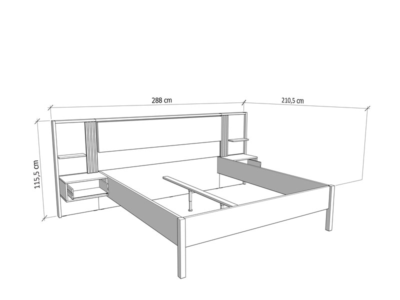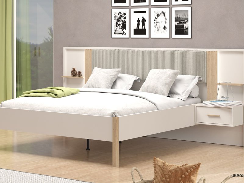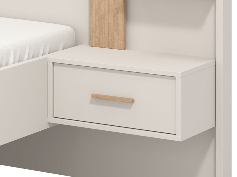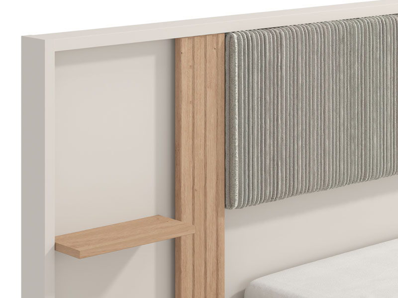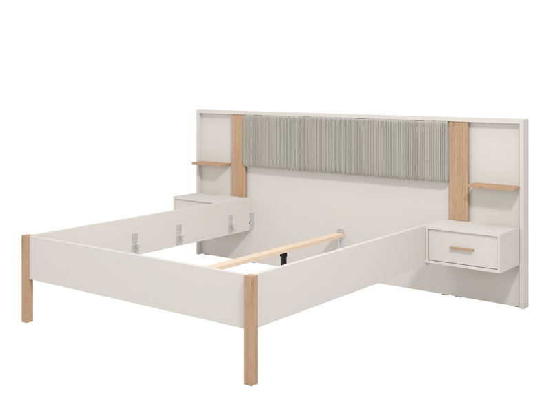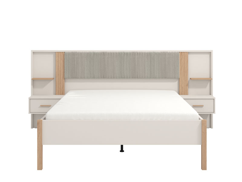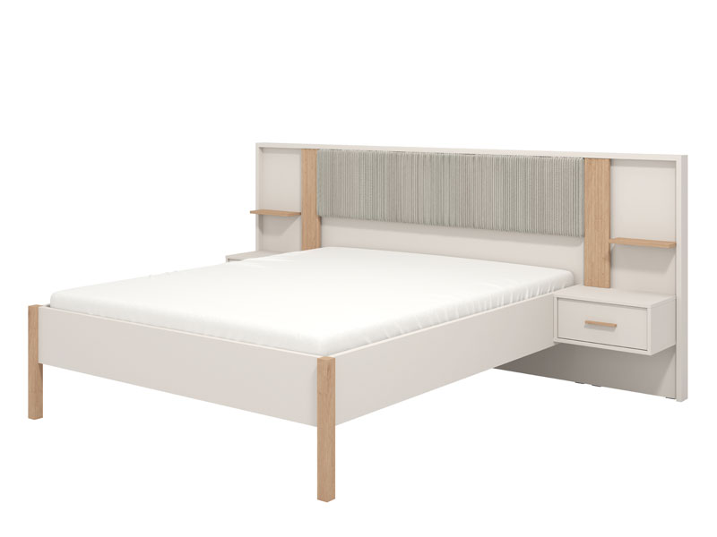 Двуспальная кровать BELFORT 180 PLUS, в сочетании декора из кашемира, ремесленного дуба и фольги ремесленного дуба, вносит изысканность и элегантность в всю обстановку и является центральным предметом мебели в обстановке спальни. Одним из преимуществ этой кровати являются встроенные тумбочки на панели изголовья, что способствует как эстетике, так и функциональности. Она совместима с матрасом размером 180 см x 200 см. Имеет возможность установки освещения. Является частью одноименной системы элементов для меблировки спальни BELFORT, современной дизайнерской формы.