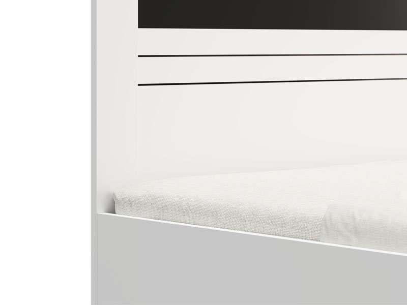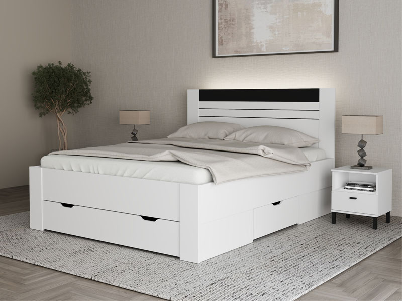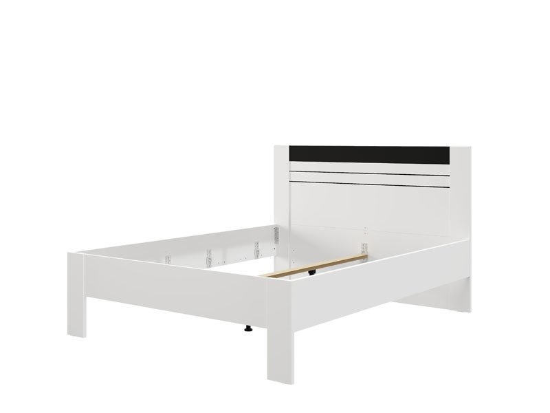 Двуспальная кровать BITINIA 160, выполненная в сочетании матового белого декора и чёрного древесного декора, придаёт спальне современный и элегантный облик, обеспечивая стабильную и функциональную основу для отдыха.
