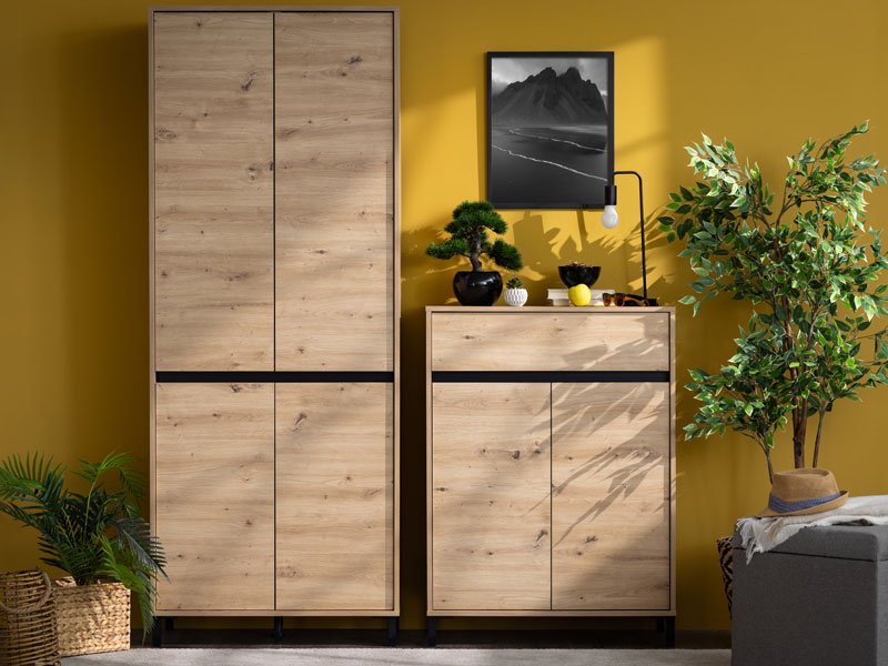 Шкафчик для обуви FLANNAN 2K1F2V в декоре артисан дуба с деталями из черной матовой фольги — это современное и функциональное решение для хранения обуви, которое можно вписать даже в прихожие меньших размеров, при этом оно будет соответствовать любому стилю оформления дома. Что отличает эту модель — её функциональность. Она включает в себя практичный закрытый отдел для хранения обуви, состоящий из двух дверок с полками, а также одну просторную выдвижную полку.