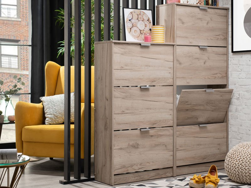 Шкаф для обуви HUGO 23 в декоре под цвет серого дуба имеет три сегмента для укладывания сезонной обуви, а благодаря своим размерам и двухуровневой планировке представляет собой очень эффективное и функциональное решение дизайна прихожей, более скромных размеров.