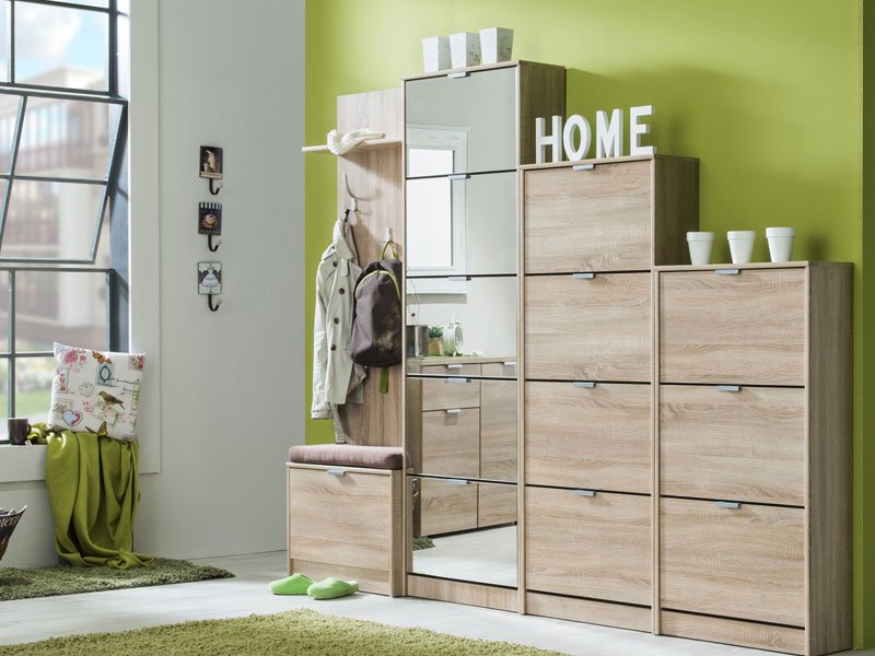 Шкаф для обуви HUGO 25 OG в сочетании зеркала с корпусом в декоре под цвет сонома дуба имеет пять сегментов для откладывания сезонной обуви, а благодаря своим размерам и двухуровневой планировки представляет собой очень эффективное функциональное решение дизайна прихожей более скромных размеров.