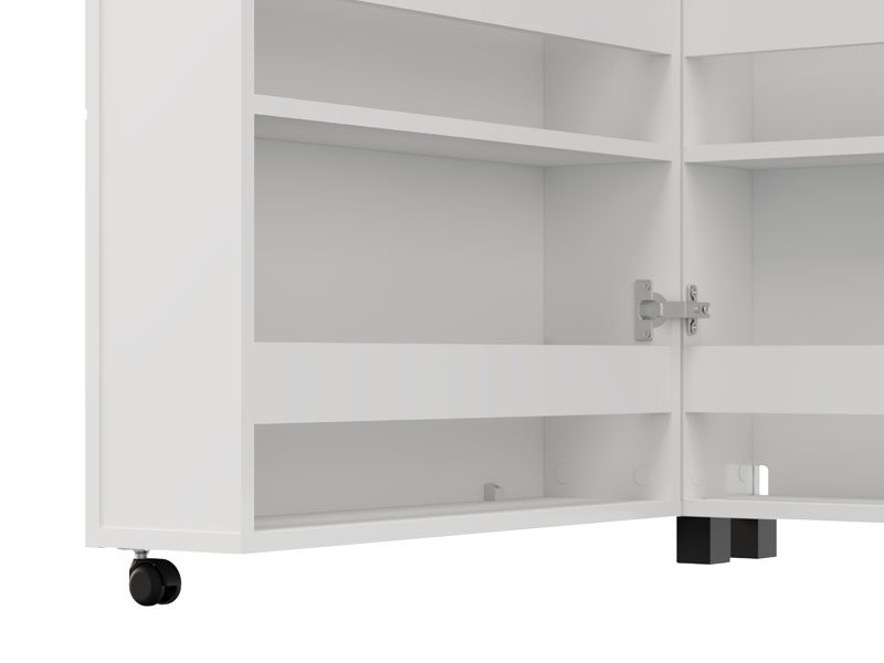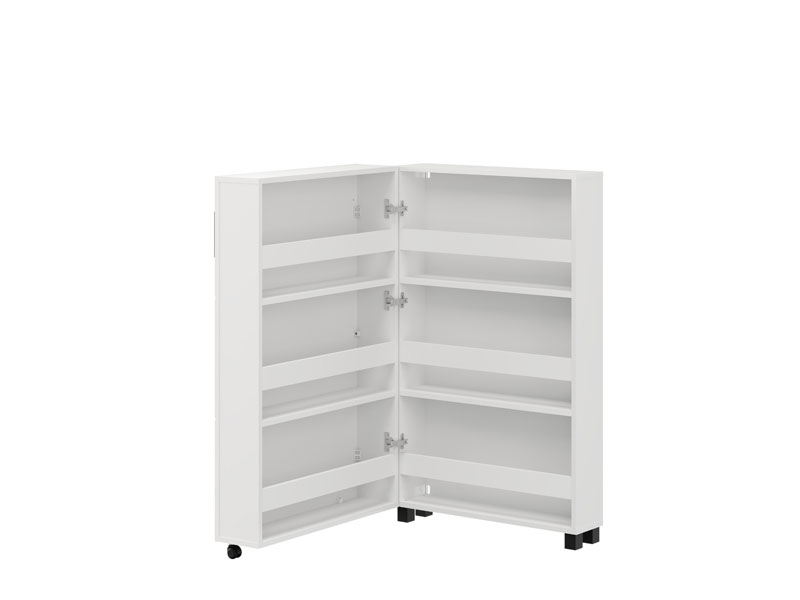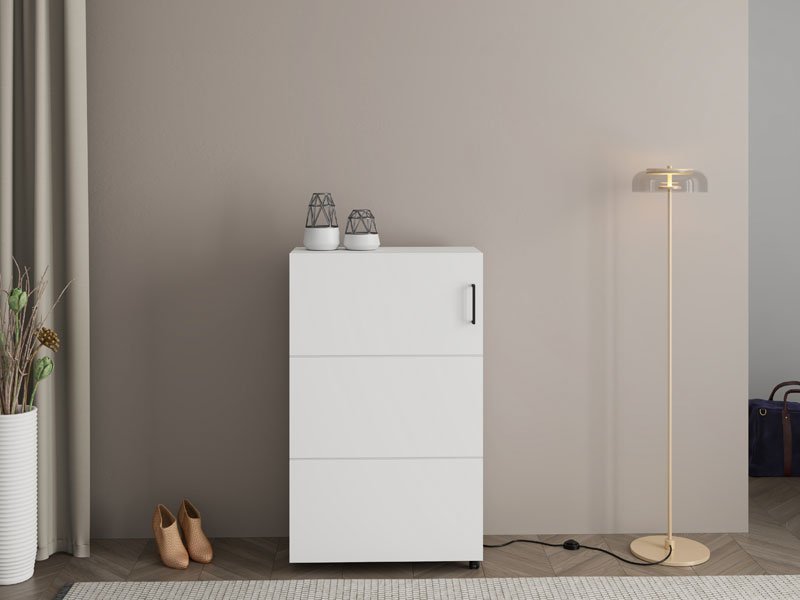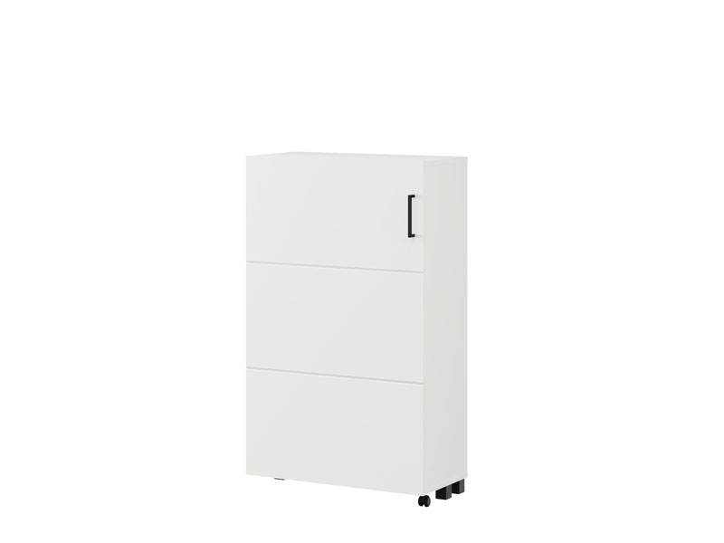 Шкафчик для обуви ISLAY 91 2K h113 в матовом белом декоре с полосами горячего тиснения представляет собой практичное и элегантное решение для прихожей. Внутреннее пространство этого одностворчатого шкафчика для обуви, выполненное по типу комода с закрытыми полками, обеспечивает наглядную и функциональную организацию обуви.