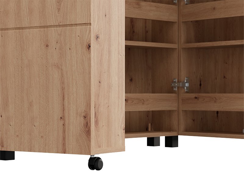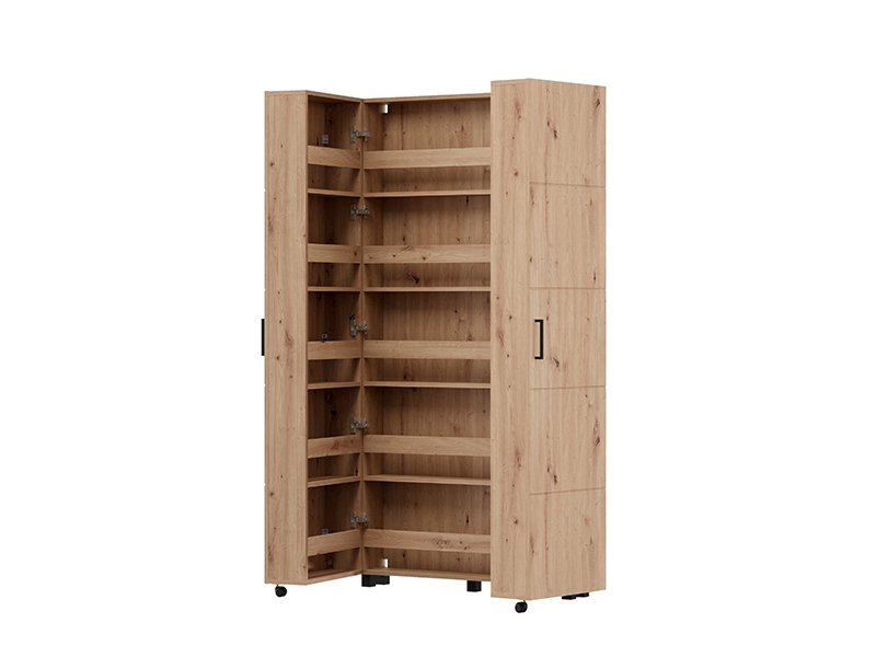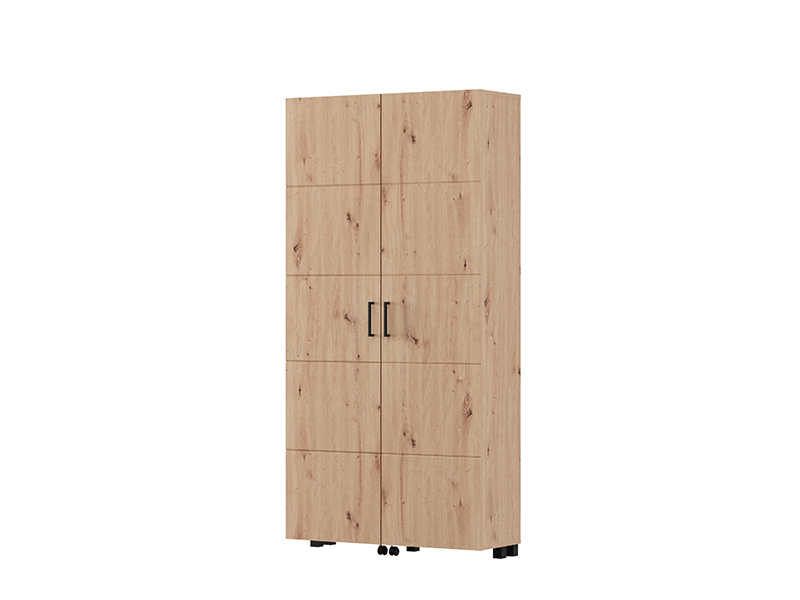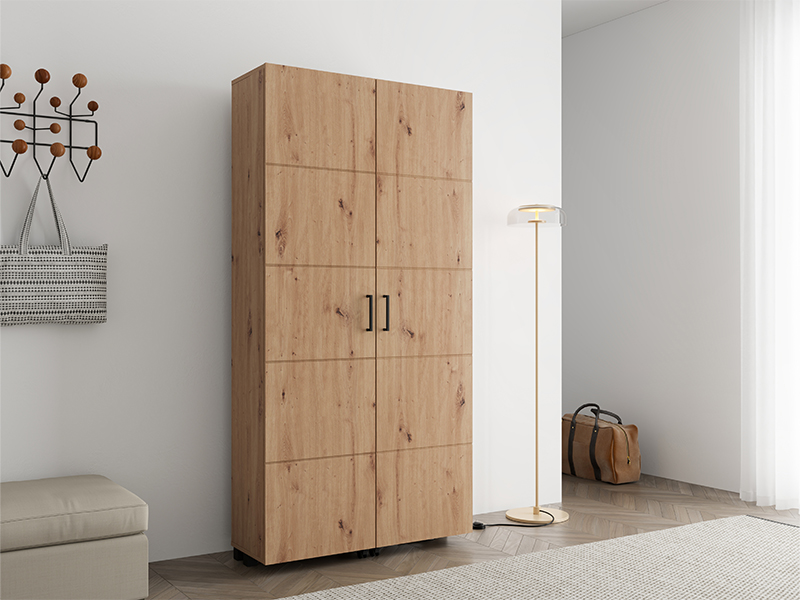 Шкафчик для обуви ISLAY 91 2K h185 в декоре ремесленного дуба с полосами горячего тиснения на двери представляет собой практичное и элегантное решение для прихожей. Внутреннее пространство этого двустворчатого шкафчика для обуви с закрытыми полками обеспечивает функциональную и наглядную организацию обуви.