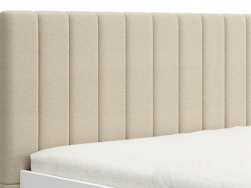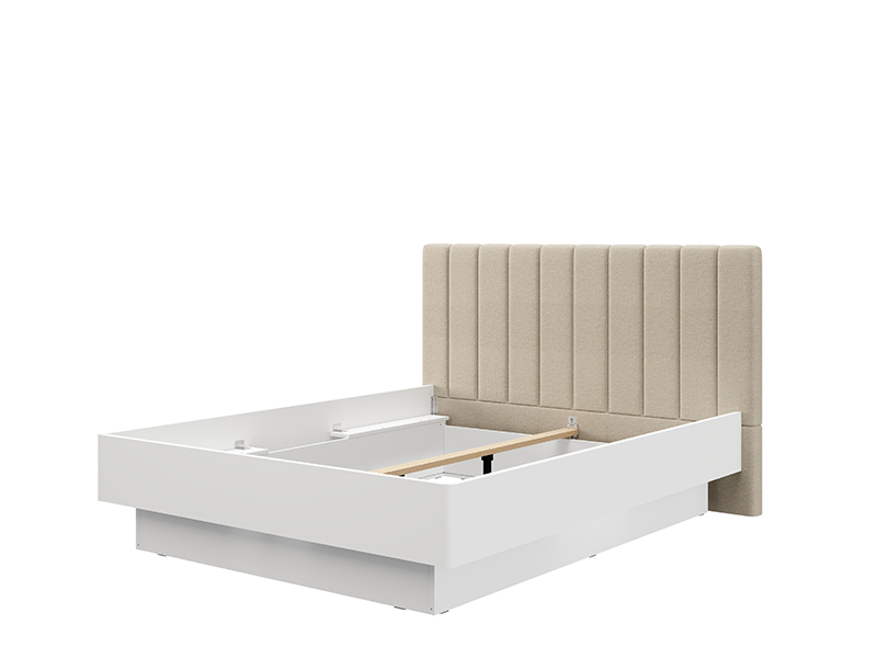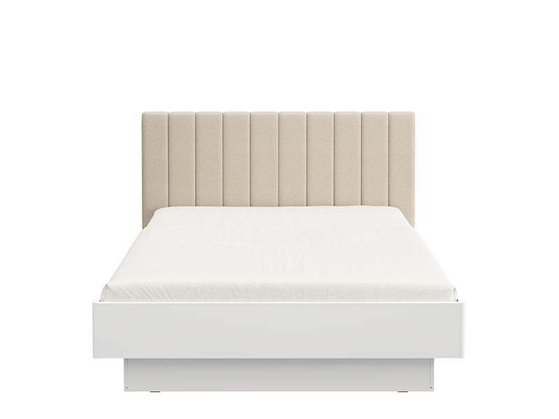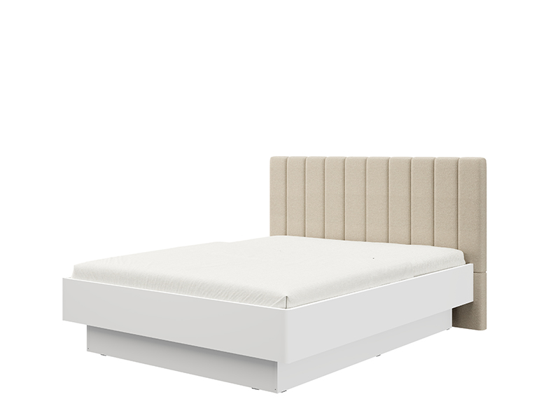 "Двуспальная кровать ABERDEEN 180, выполненная в сочетании матового белого декора и бежевого мягкого изголовья, придаёт спальне современный и элегантный вид, подчёркивая контраст материалов и чётко выраженную геометрическую линию дизайна.