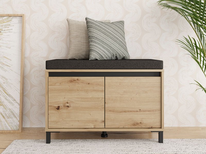 Элемент прихожей ARRAN KOM, в декоре артисан дуба с деталями, выполненными из черной матовой фольги, имеет практичный двухдверный закрытый отдел для хранения обуви и подушку для сиденья в черном дизайне. Его можно сочетать с другими элементами коллекции для предсобья ARRAN, которые завершают интерьерную концепцию входа в ваш дом.