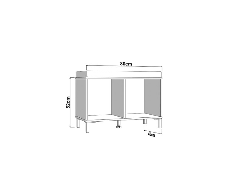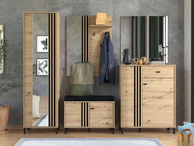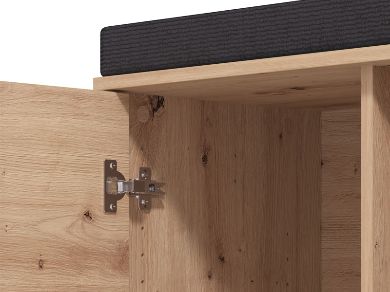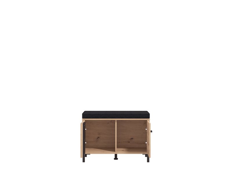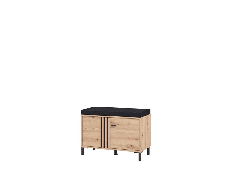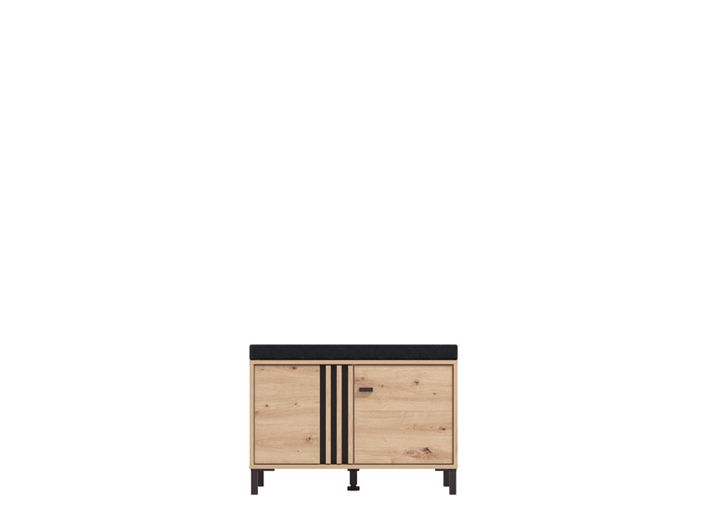Элемент прихожей LAVAL KOM 2K2V, выполненный в комбинации декора ремесленного дуба, чёрного декора и фольги ремесленного дуба, оснащён практичным двухсекционным закрытым отсеком для хранения обуви, при этом поверхность с подушкой из тёмно-серой ткани может служить местом для сидения. Данный элемент может комбинироваться с другими элементами коллекции LAVAL, образуя гармоничную и функциональную интерьерную композицию входной зоны.