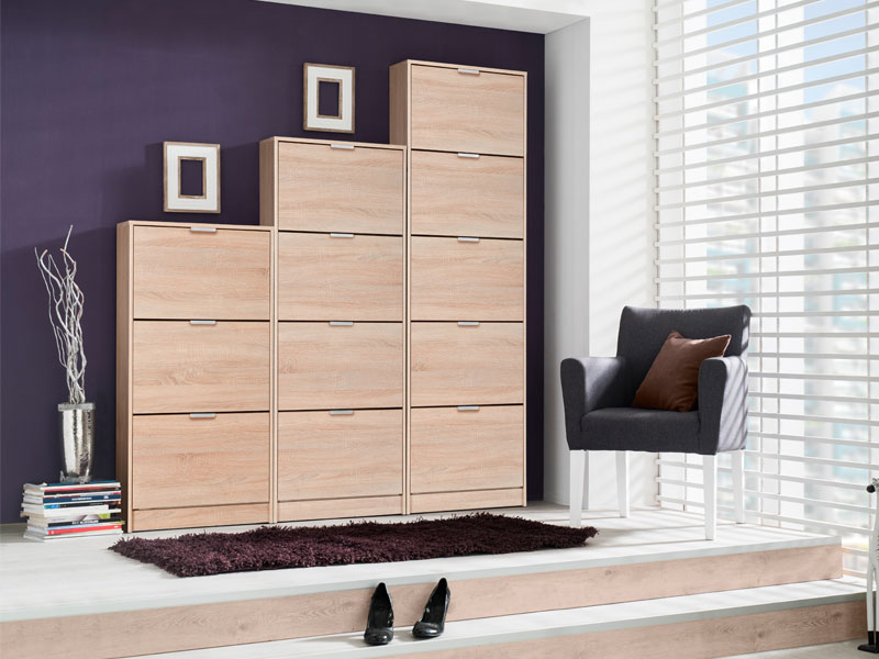 Шкаф для обуви HUGO 25 в декоре под цвет сонома дуба имеет пять сегментов для укладывания сезонной обуви, а благодаря своим размерам и двухуровневой планировке представляет собой очень эффективное и функциональное решение дизайна прихожей более скромных размеров.