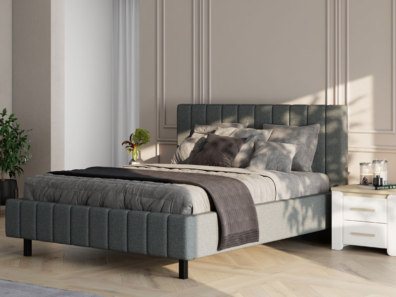 Точное наименование узора: Tкань VIBE 95 серый. Двуспальная кровать JOY с мягкой обивкой каркаса и изголовья представляет собой привлекательное и функциональное решение для обустройства современного интерьера спальни. Её современный дизайн придаёт пространству утончённость и элегантность, а изделие совместимо с матрасом размером 160×200 цм. В базовой версии кровать поставляется без основания и матраса, что позволяет адаптировать её под индивидуальные потребности и стиль интерьера.