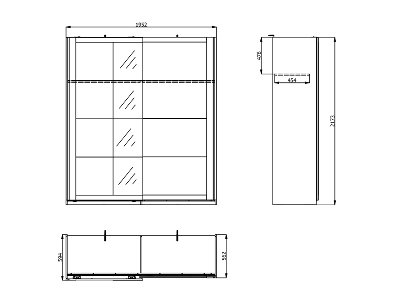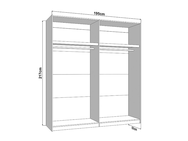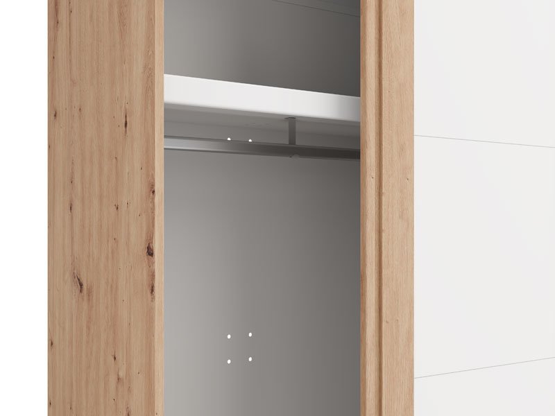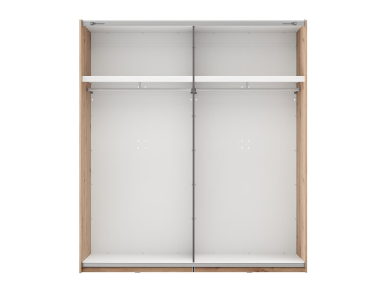 Функциональное пространство шкафа составляют две штанги для одежды, при этом предусмотрена возможность последующего добавления полок, что улучшает наглядность и организацию гардероба. Также возможна установка доводчика раздвижного механизма для тихого использования, а также добавление подсветки, которая улучшает обзор и визуальное восприятие внутреннего пространства.