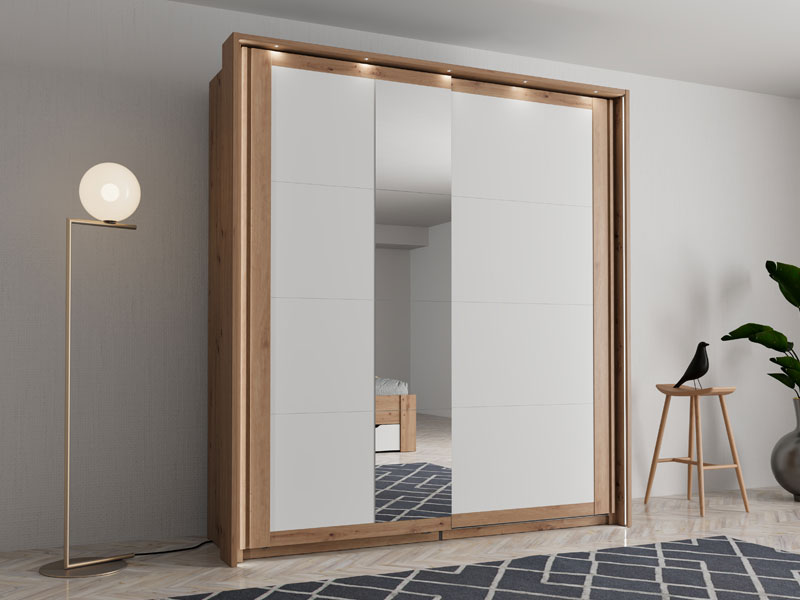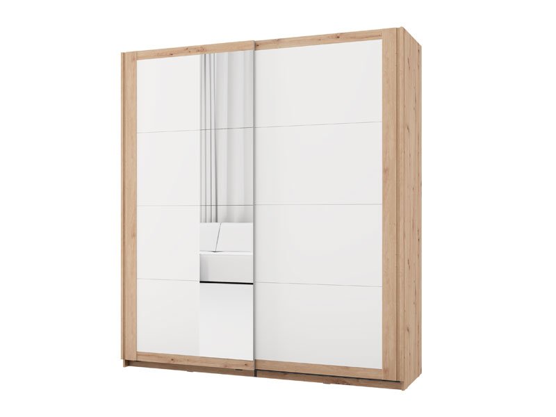 Шкаф CARTENA 200 OG h217, выполненный в сочетании матового белого декора, декора ремесленного дуба и фольги ремесленного дуба, придаёт спальне современный и элегантный облик, подчёркивая контраст и чёткую геометрическую форму. Одна дверь шкафа оснащена зеркалом, что дополнительно повышает функциональность и визуально расширяет пространство.