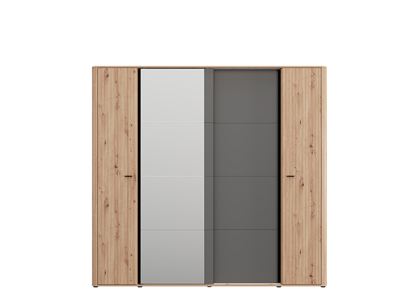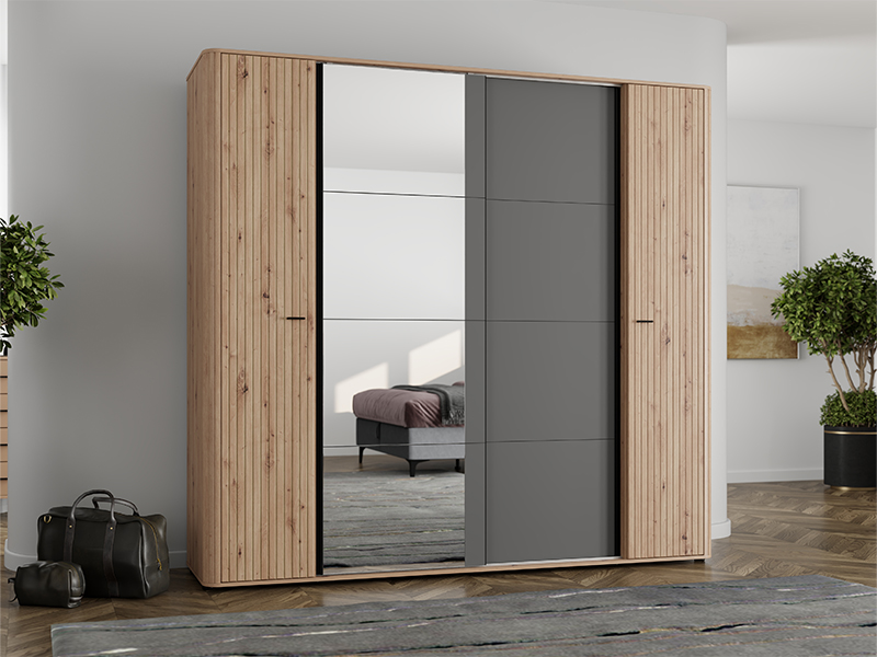 "Шкаф SINOP 150 KL2K OG h217, выполненный в сочетании декора ремесленного дуба, фольги ремесленного дуба, графитово-серого и чёрного древесного декора, придаёт спальне современный и утончённый облик, подчёркивая контраст и чётко выраженную геометрическую линию дизайна.