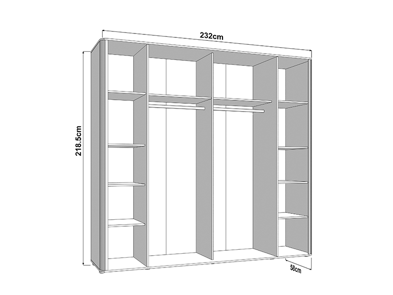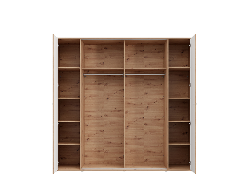 Полезное внутреннее пространство гардеробного шкафа включает две штанги для одежды и два секционных отделения, что обеспечивает удобное и наглядное хранение одежды и мелких предметов. Одна дверь оснащена зеркалом, которое дополнительно повышает функциональность и визуально расширяет пространство.