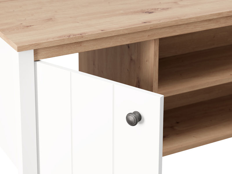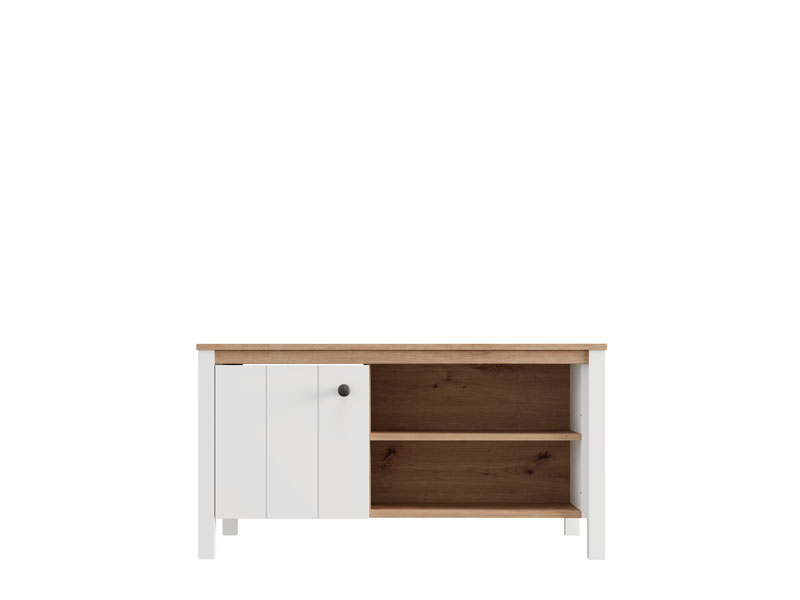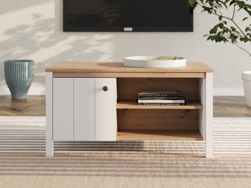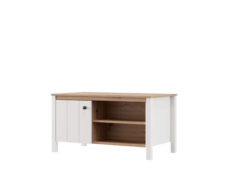 Журнальный стол BEDFORD KS 2V, выполненный в сочетании матового белого декора, декора ремесленного дуба, белой матовой фольги и фольги ремесленного дуба, привносит в пространство тепло, элегантность и природное очарование. Полезное пространство включает секционное отделение с двусторонним закрыванием, а также полку под столешницей, что обеспечивает практичное и упорядоченное хранение различных предметов. Журнальный стол BEDFORD KS 2V является частью системы элементов BEDFORD, отличающейся сочетанием рустикальной эстетики и функционального современного дизайна.