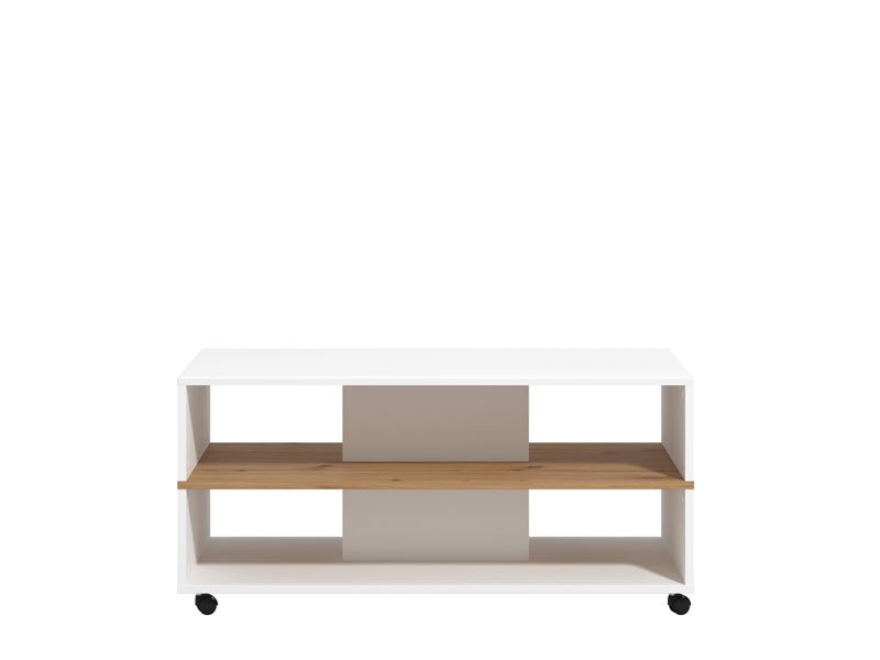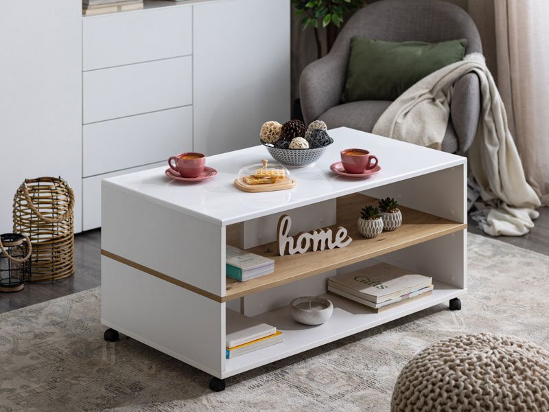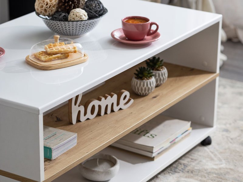 Журнальный стол SAVIO в сочетании чисто белого декора, ремесленного дуба и белой лаковой пленки имеет практические и эстетические преимущества. Доминирующей деталью в облике этого журнального стола является эффектная полка контрастного декора под столешницей, подходящая для хранения любимых книг или журналов. Журнальный стол SAVIO вносит свой вклад в современную тематическую концепцию оформления гостиной.