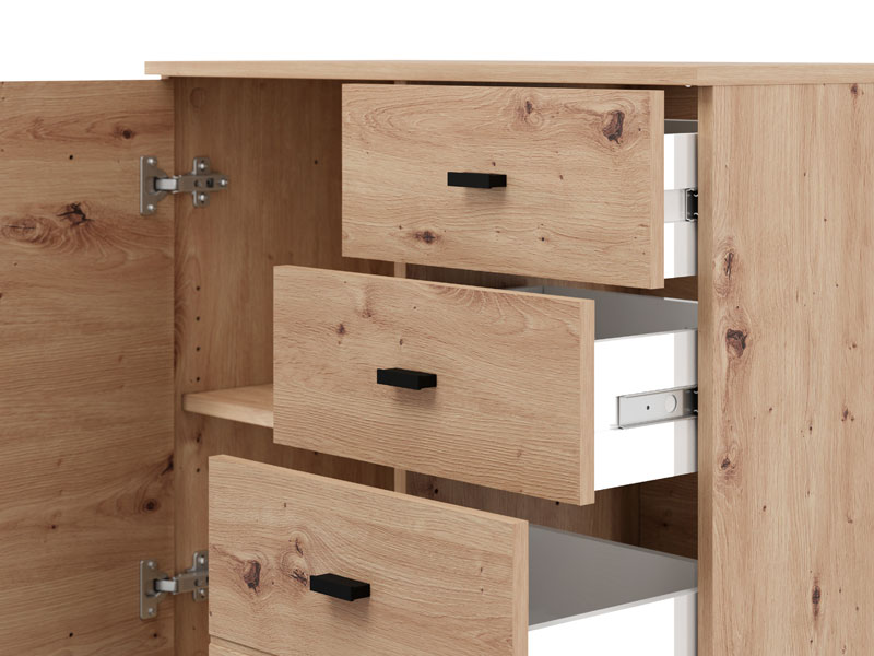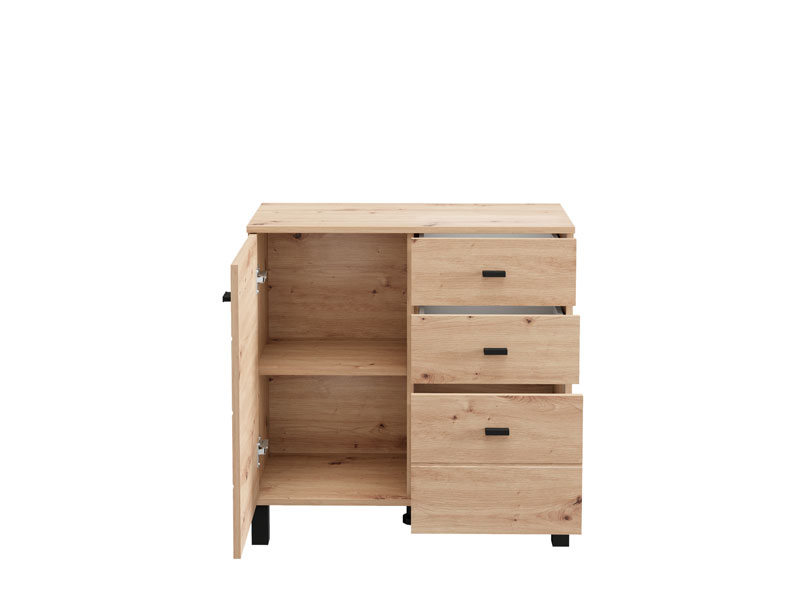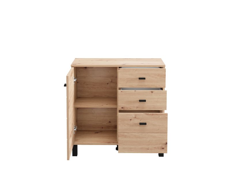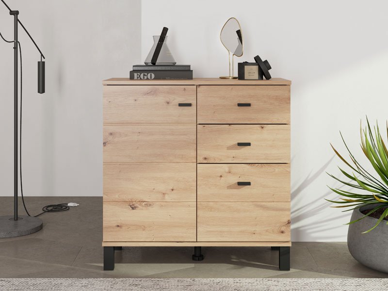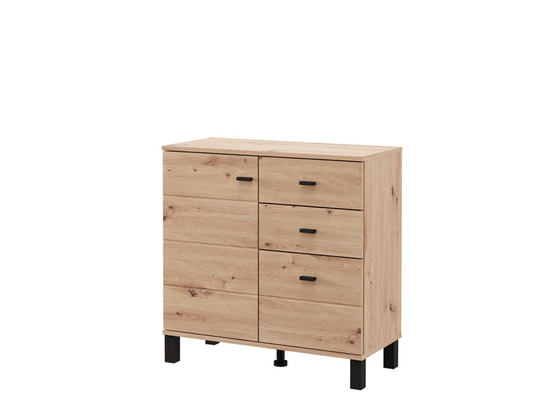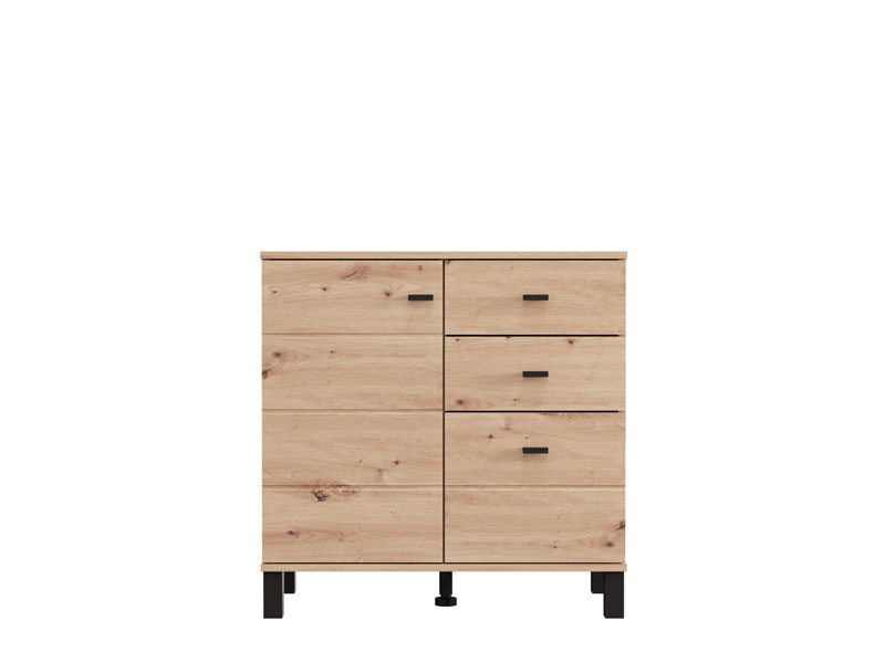Комод ALMOND 77 2K3F1V, выполненный в декоре ремесленного дуба, привносит теплоту и приятную атмосферу в пространство, сочетая компактную форму и функциональное расположение элементов. Двухстворчатая форма обеспечивает наглядно организованное полезное пространство, включающее одну закрытую секцию с перегородками, а также три выдвижные ящика - два более мелких, предназначенных для мелочей, и один более глубокий для хранения более крупных предметов. Благодаря практичности и естественной эстетике древесного декора, комод ALMOND 77 2K3F1V является идеальным выбором для прихожей, спальни или небольшой гостиной зоны.