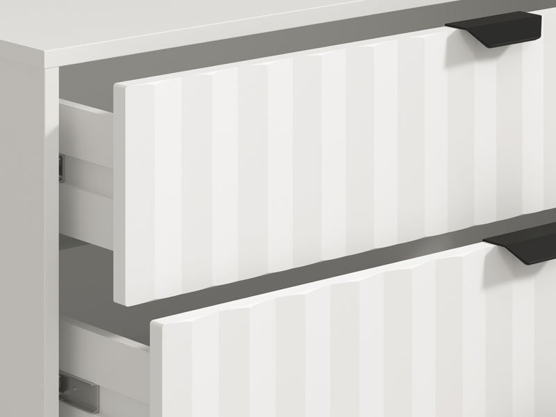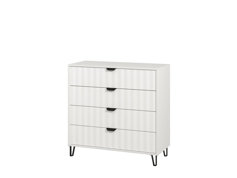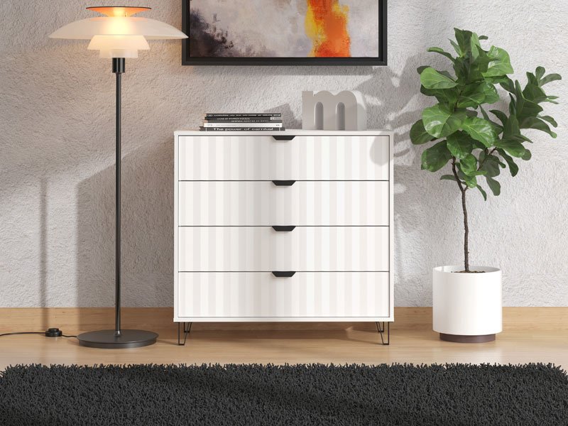 Комод BREST 4F в сочетании чисто белого декора и белой матовой пленки, благодаря своему дизайну, обеспечивает полезное пространство, состоящее из четырех просторных ящиков, и относится к элементам с высокой эксплуатационной ценностью. Комод BREST 4F подойдет для обустройства прихожей, гостиной, детской или спальни.