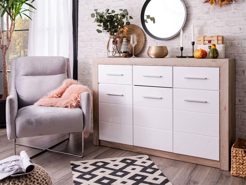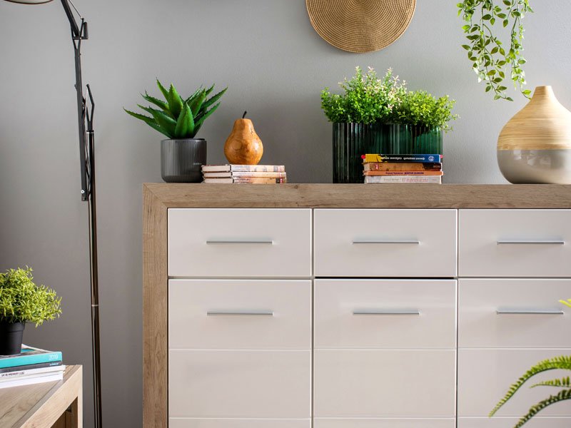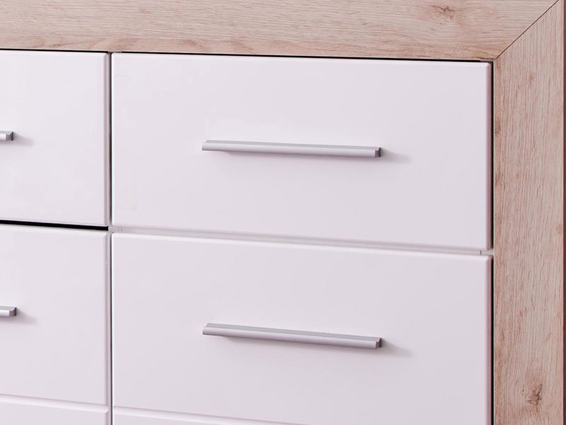Комод ETNA 3K3F в комбинации декора под цвет серого дуба с фронтальной частью, покрытой белой лакированной фольгой, имеет практическое полезное пространство, состоящее из трёх практических сегментов с раздельными полками и тремя ящиками. Благодаря своему дизайну комод ETNA 3K3F совместим с различными моделями мебели, предназначенными для оснащения гостиной, спальной или прихожей.