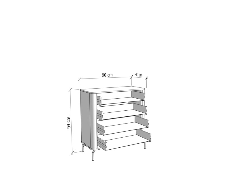 Отлично организованное пространство комода состоит из четырех просторных ящиков. Это часть одноименной системы элементов для обустройства спальни SERDICA, с современным дизайном, округлыми краями на элементах и высокими ножками, которые подчеркивают привлекательность современно спроектированного интерьера."