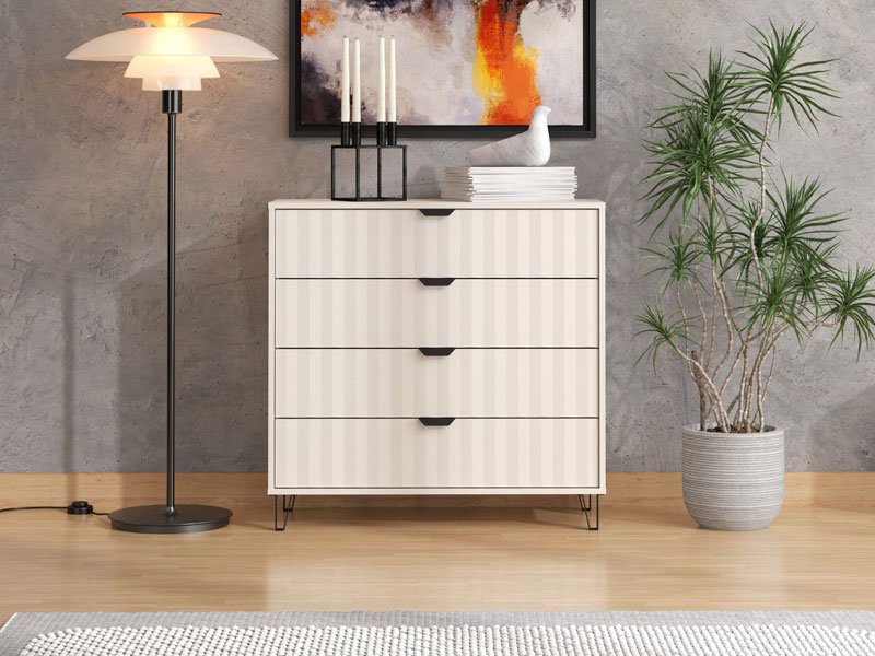 Комод BREST 4F в сочетании кашемирового декора и кашемировой пленки, благодаря своему дизайну, обеспечивает полезное пространство, состоящее из четырех просторных ящиков, и относится к элементам с высокой эксплуатационной ценностью. Комод BREST 4F подойдет для обустройства прихожей, гостиной, детской или спальни.