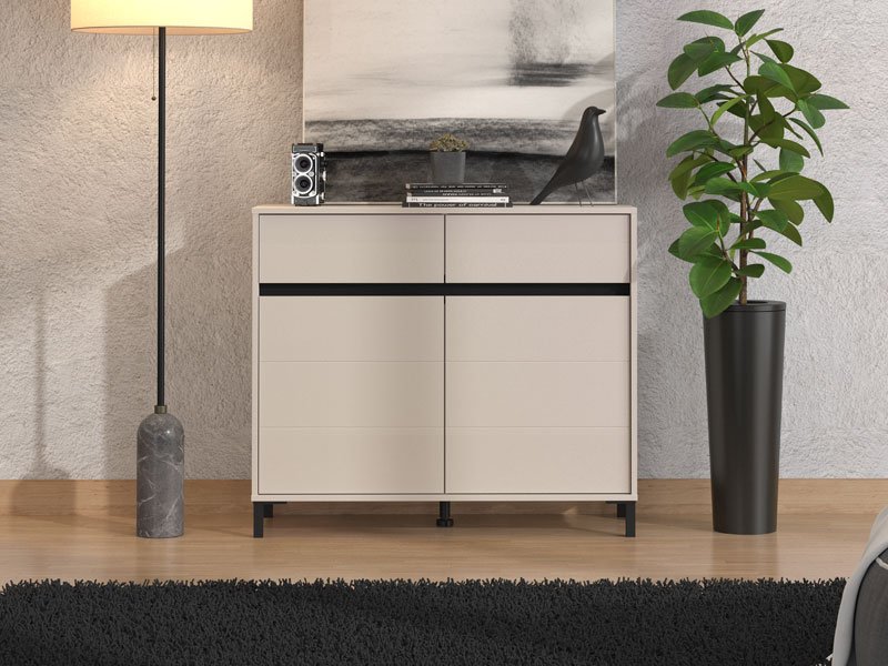 Комод MARRON 106 2K2F2V в комбинации кашмирного декора и черной матовой фольги — это функциональный элемент мебели, который необходим в каждом интерьере дома. Отлично организованное пространство этого комода состоит из двух закрытых разделов и двух практичных ящиков.