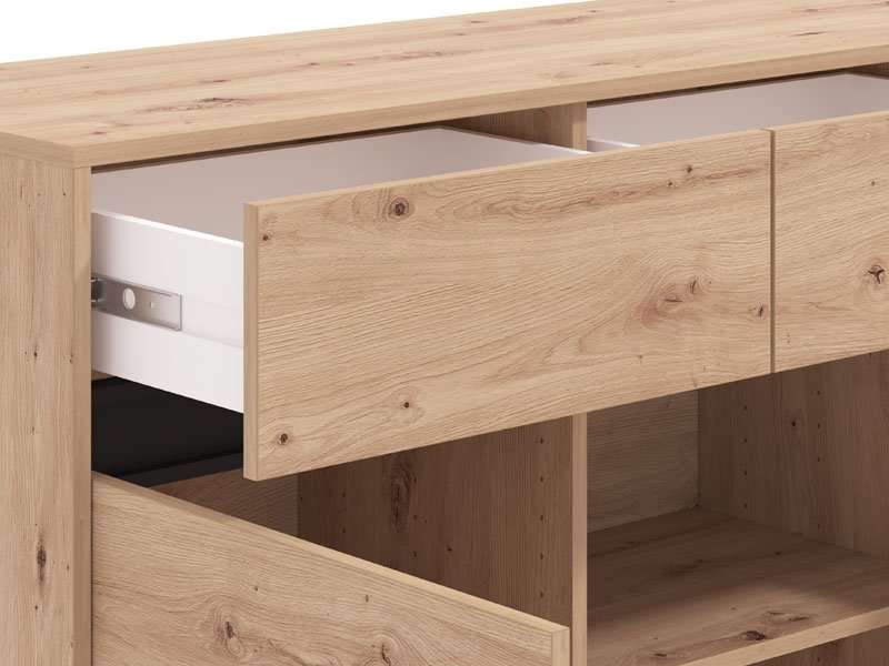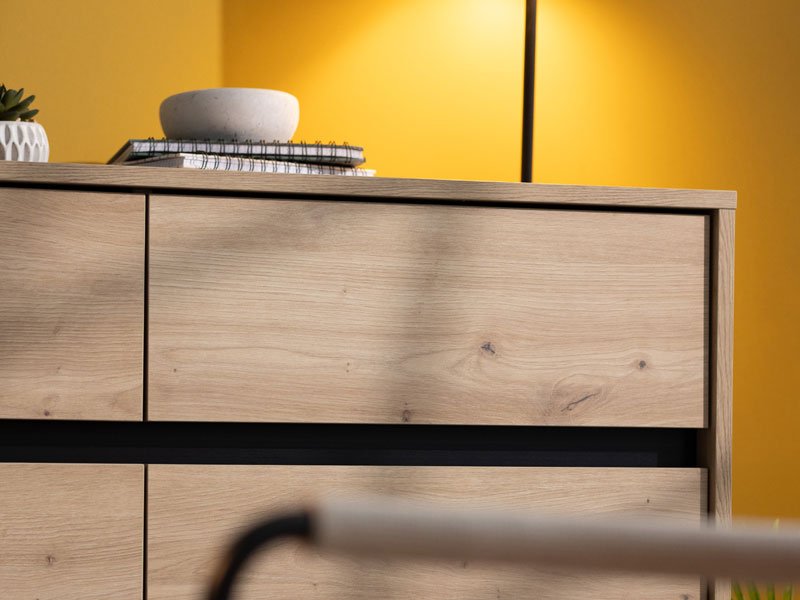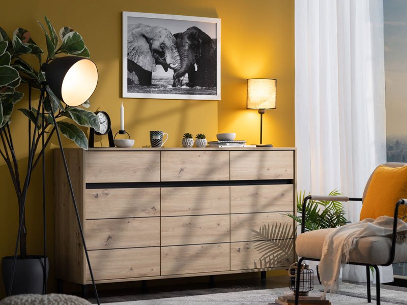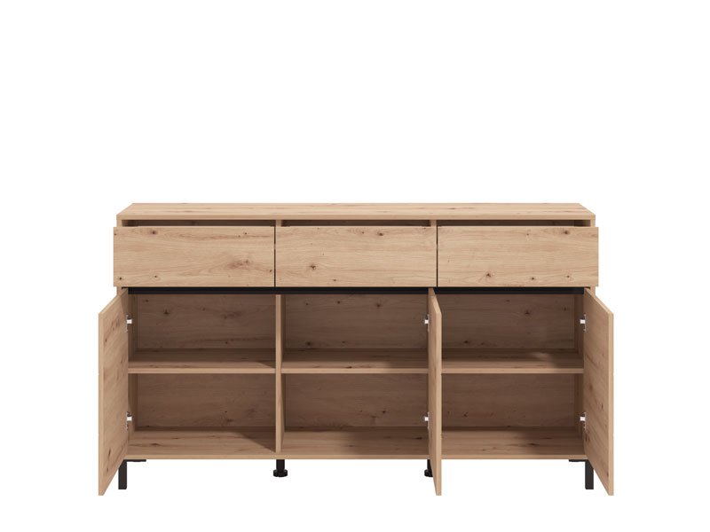 Комод MARRON 157 3K3F3V в комбинации декора артисан дуба с черной матовой фольгой — это функциональный элемент мебели, который необходим в каждом интерьере дома. Отлично организованное пространство этого комода состоит из трех закрытых разделов и трех практичных ящиков.