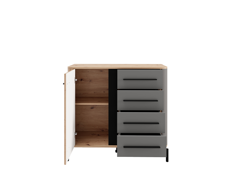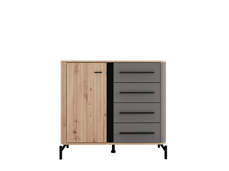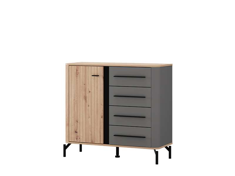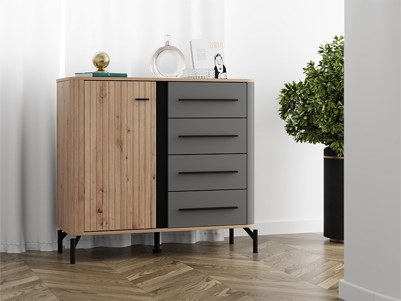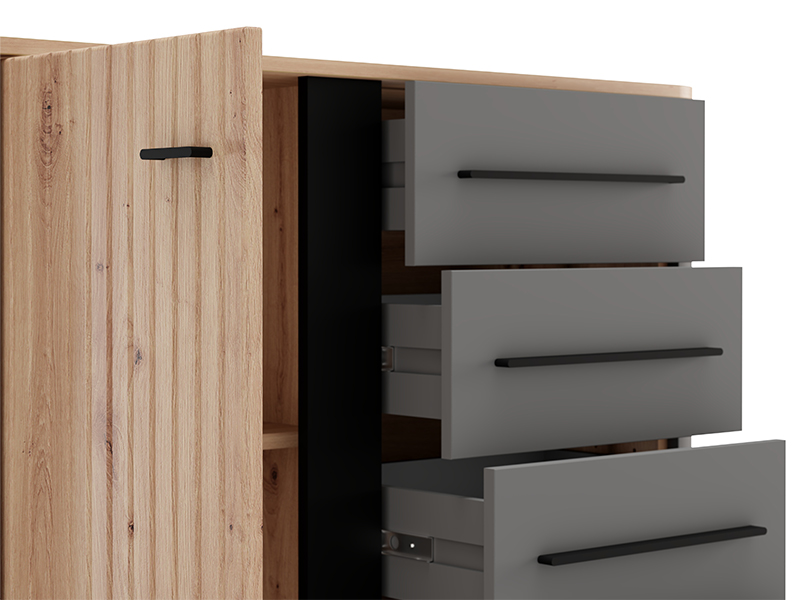 Комод SINOP 103 2K4F1V, выполненный в сочетании декора ремесленного дуба, фольги ремесленного дуба, графитово-серого и чёрного древесного декора, придаёт спальне современный и элегантный вид, подчёркивая контраст и чётко выраженную геометрическую линию дизайна. Полезное пространство комода включает один закрытый секционный отсек и четыре выдвижных ящика, которые обеспечивают удобное и наглядное хранение гардероба и других предметов, повышая функциональность и организованность пространства. Комод SINOP 103 2K4F1V является частью одноимённой коллекции для оформления спальни SINOP, отличающейся современной и сдержанной дизайнерской формой.
