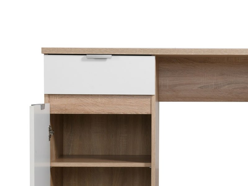 Компьютерный стол ЯН сонома дуб и белого цвета поможет создать в рабочем помещении обстановку достижения максимального результата. Эта модель обладает практичной рабочей поверхностью, под которой находится ящик и закрытая секция для ранения важных предметов.