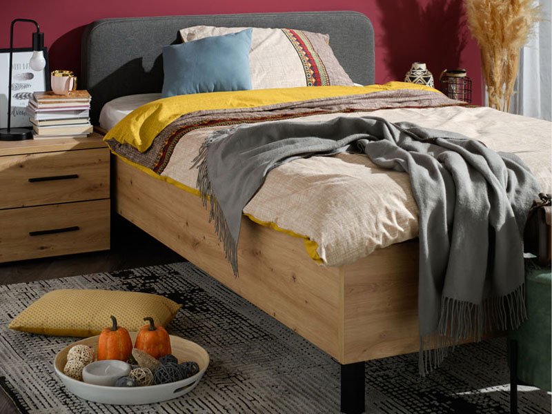 Кровать BARLETA 120 с декором ремесленного дуба, с обтянутым изголовьем и черными ножками предназначена для обустройства пространства для отдыха и сна. Она подходит практически для любого интерьера и сочетается с матрасом размера 120 см x 200 см.