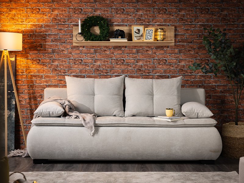 Точное название дизайна: сиденье/спинка/большая подушка/малая подушка, ткань WIND 80 бежевый. Кровать MINA, помимо очень привлекательного и современного дизайна и ткани, обладает весьма практичными эксплуатационными характеристиками и полностью удовлетворяет потребности современного жизненного пространства. Короб для хранения постельного белья увеличивает функциональность, а полезная поверхность для отдыха и сна размером 150x200 см предоставляет дополнительный комфорт этой модели кровати.