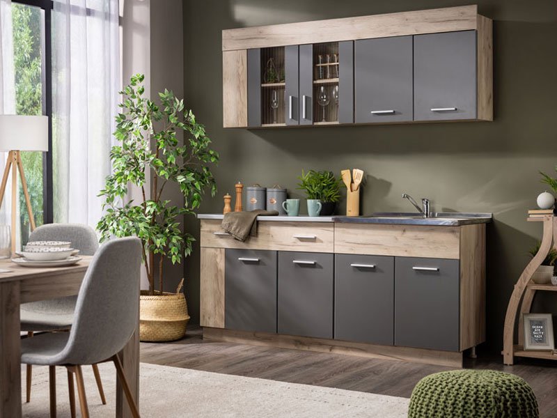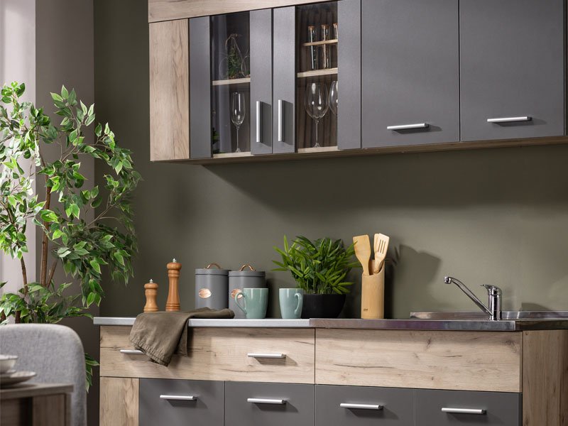 Кухня LEONA в дизайне серого дуба и графитового серого цвета является идеальным выбором для обустройства помещений разных размеров, а ее дизайн, соответствующий интерьерным трендам, сделает обстановку приятной и практичной. Эту модель отличают полузастекленные подвесные элементы, способствующие эстетичности, а также вместительный выдвижной ящик.
