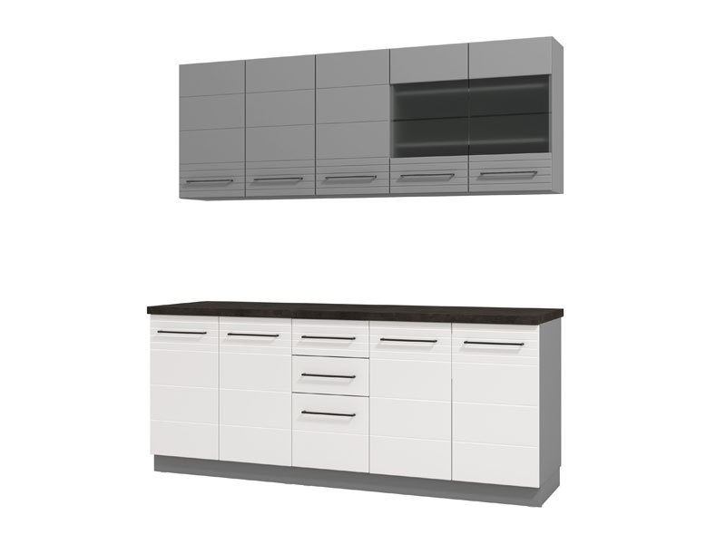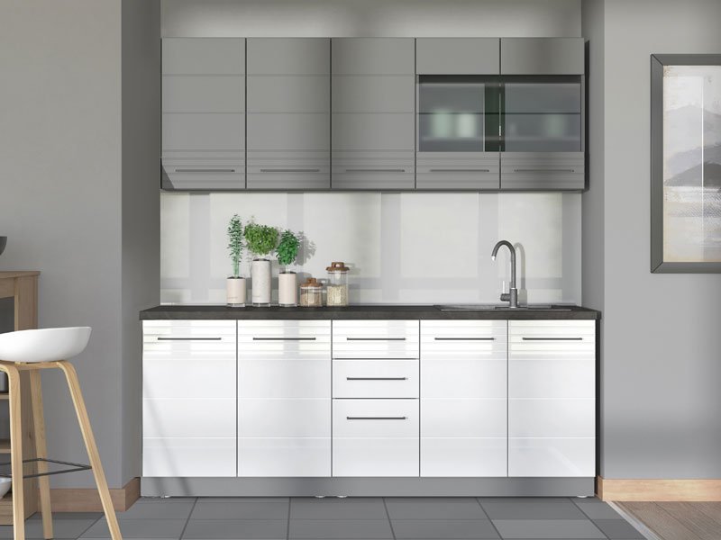 Кухня PETRA 200 представляет собой комплексное решение для обустройства кухонных помещений. Уникальный современный дизайн в сочетании графитово-серого цвета, белой лаковой и серой матовой пленки отвечает эстетическим требованиям при оформлении любого помещения. Имеет практично организованное пространство для хранения, состоящее из перегородок в нижнем и подвесном сегментах, а также двух выдвижных ящиков.*Примечание: Цена указана без столешницы и мойки.
