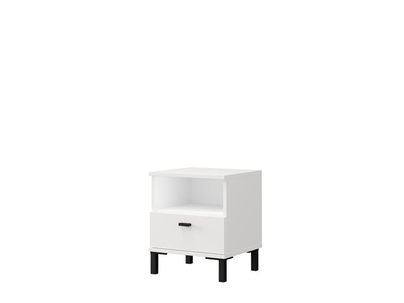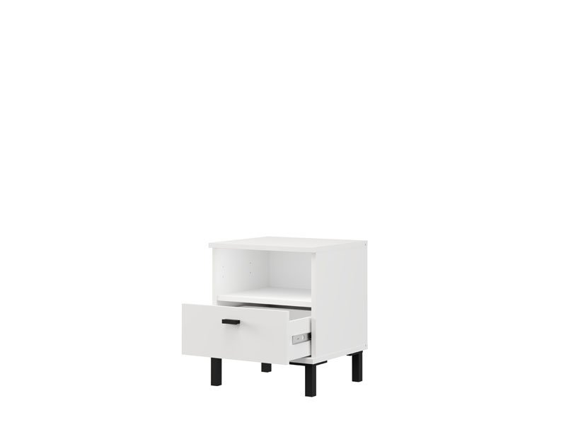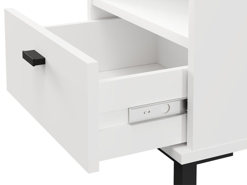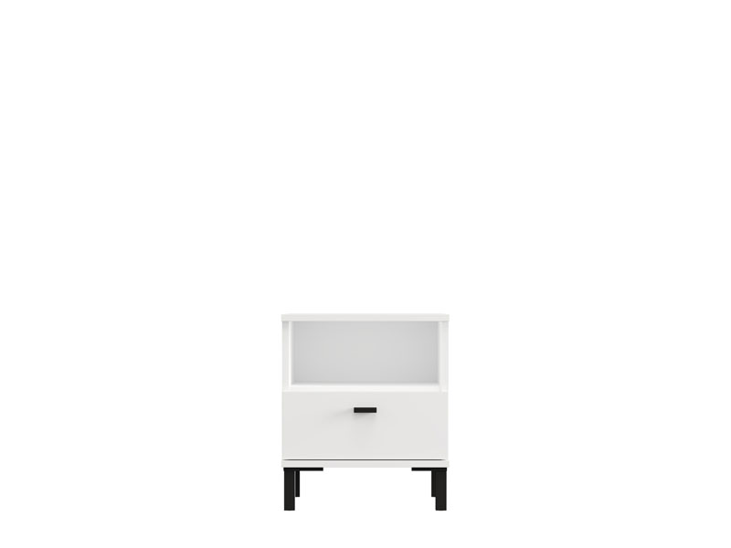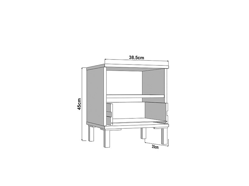 Функциональное пространство тумбы включает один выдвижной ящик и одну открытую полку, что позволяет удобно размещать мелкие предметы и повседневные принадлежности.