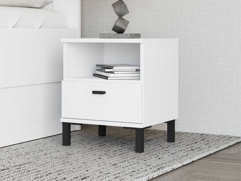 Прикроватная тумба BITINIA NO1F, выполненная в сочетании матового белого декора и чёрного древесного декора, придаёт спальне современный и элегантный облик, одновременно обеспечивая функциональное и наглядно организованное пространство рядом с кроватью.