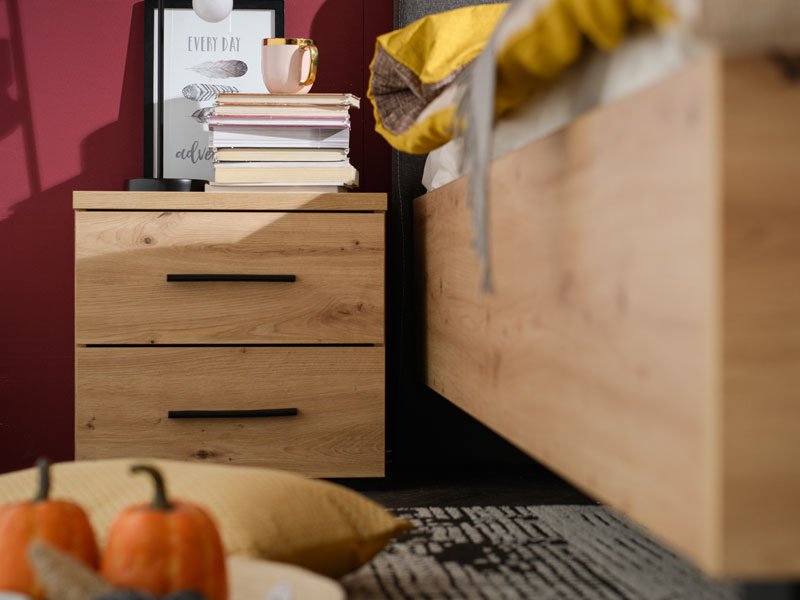 Прикроватная тумба DADO NO2F расцветки ремесленный дуб, имеет практичный дизайн с двумя вертикально размещенными выдвижными ящиками. Представляет собой функциональный элемент спального гарнитура и эстетически дополняет обстановку.