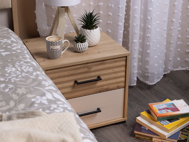 Прикроватная тумба MODENA NO2F в комбинации декора ремесленного дуба, пленки ремесленного дуба и кашемирового декора представляет собой сочетание функциональности и современного дизайна предмета мебели, который является необходимым и очень практичным элементом в любой спальне.