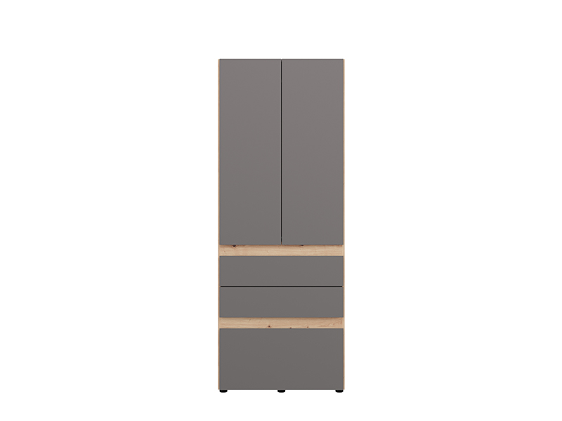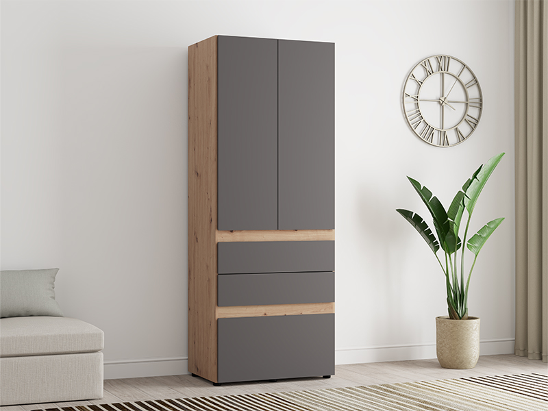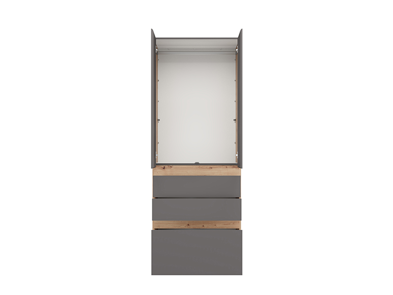 Шкаф ARDERIN 2K3F h207, выполненный в комбинации декора ремесленного дуба и графитово-серого декора, представляет собой элегантное и современное решение для организации одежды. Полезное пространство включает двустворчатую часть с гардеробной штангой, под которой расположены три ящика - два более мелких и один глубокий, что обеспечивает наглядную и практичную организацию одежды и аксессуаров. Шкаф выполнен без видимых ручек, что подчёркивает изысканный и минималистичный внешний видц.