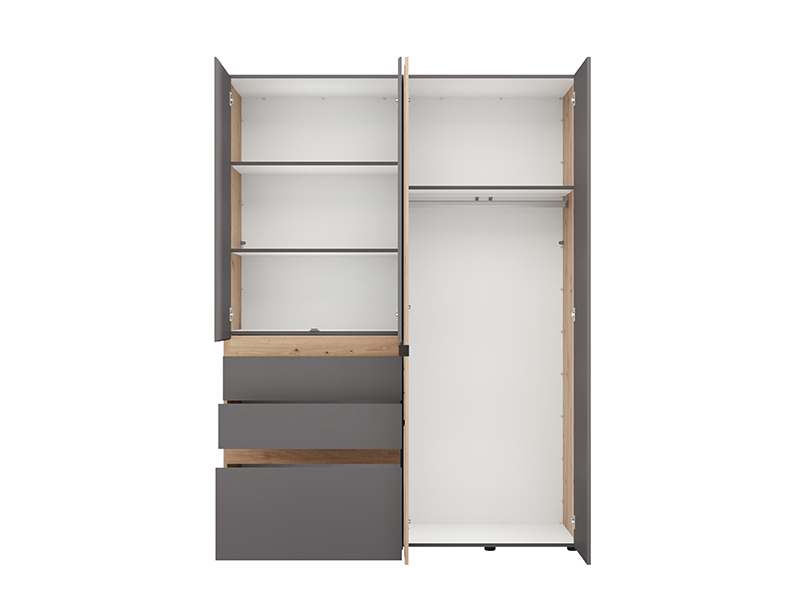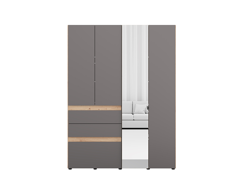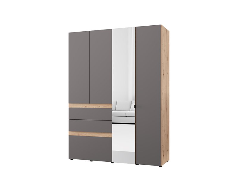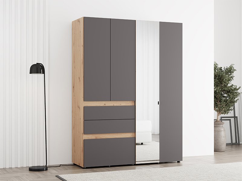 Шкаф ARDERIN 4K3F1O h207, выполненный в комбинации декора ремесленного дуба и графитово-серого декора, представляет собой элегантное и современное решение для организации одежды. Полезное пространство включает двустворчатую часть с полками, под которой расположены три ящика, а также двустворчатую часть с гардеробной штангой. Одна створка этого четырёхстворчатого шкафа оснащена зеркалом; также предусмотрена возможность добавления комплекта полок для дополнительной функциональности внутреннего пространства.