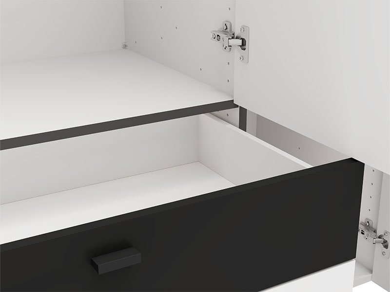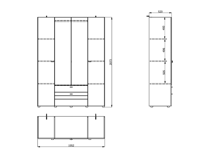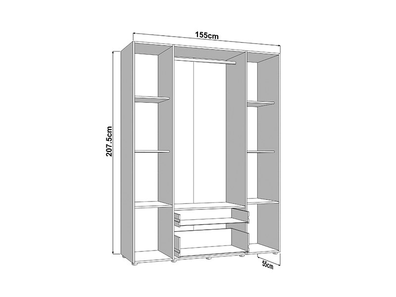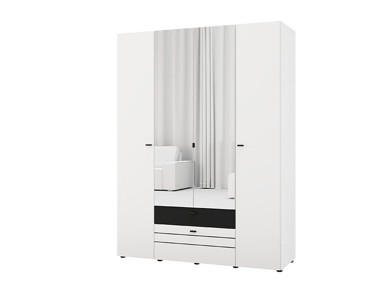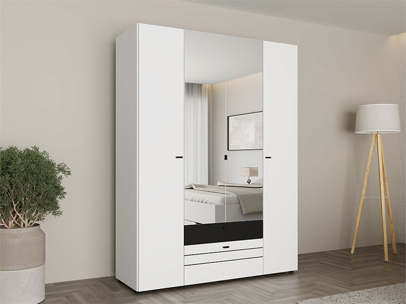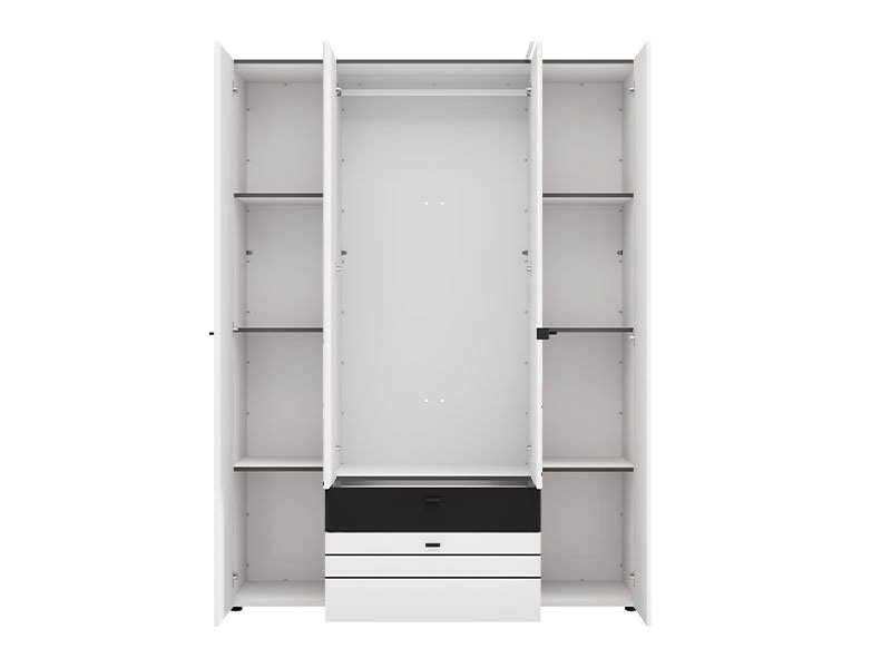 Функциональное пространство четырёхстворчатого шкафа организовано следующим образом - центральная часть оснащена штангой для одежды, предназначенной для хранения вещей на вешалках, тогда как левая и правая секции представляют собой закрытые сегменты с полками, предназначенные для наглядного хранения одежды и аксессуаров. Шкаф также оснащён двумя выдвижными ящиками для мелких предметов.