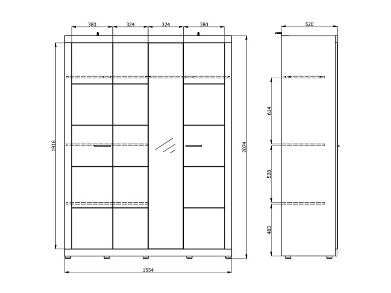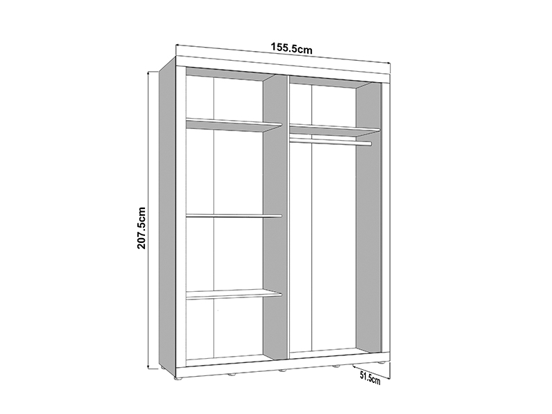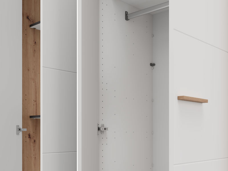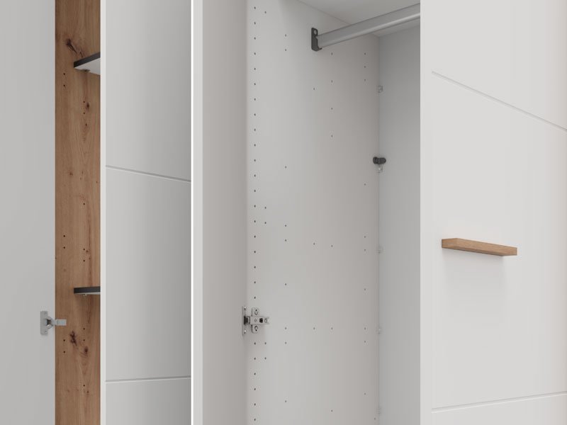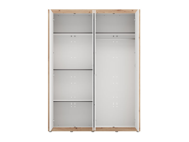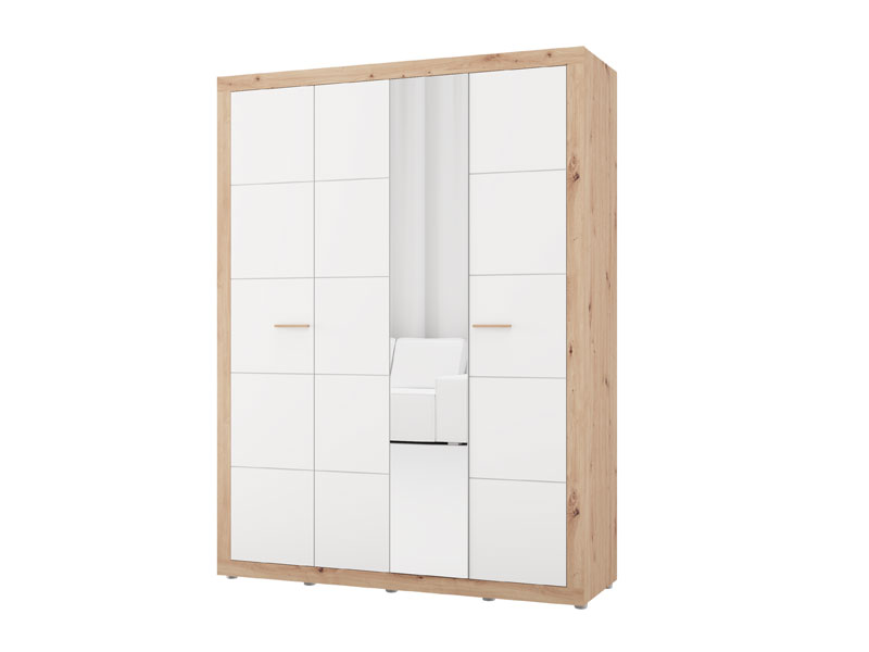 Функциональное пространство четырёхствочатого шкафа организовано следующим образом - одно двустворчатое отделение оснащено штангой для одежды, а второе двустворчатое отделение оборудовано полками для наглядного и удобного хранения одежды и мелких предметов. Шкаф также предусматривает возможность последующего добавления комплекта полок, что дополнительно повышает функциональность внутреннего пространства.