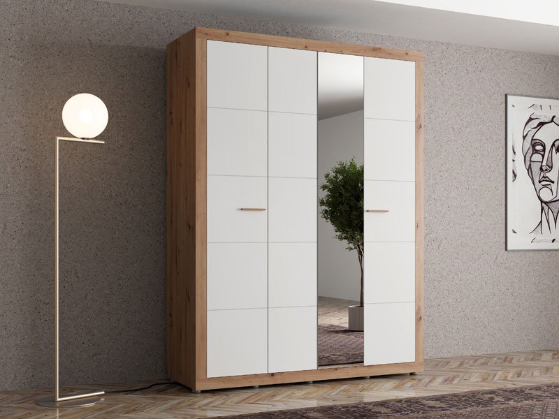 Шкаф CARTENA 4K1O h207, выполненный в сочетании матового белого декора, декора ремесленного дуба и фольги ремесленного дуба, придаёт спальне современный и элегантный облик, подчёркивая контраст материалов и чёткую геометрическую линию дизайна. Одна дверь шкафа оснащена зеркалом, что дополнительно повышает функциональность и визуально расширяет пространство.