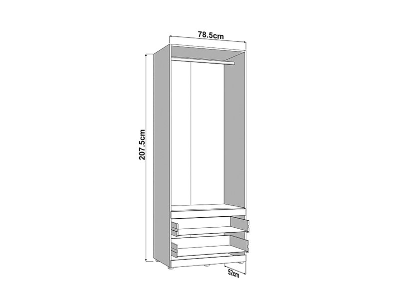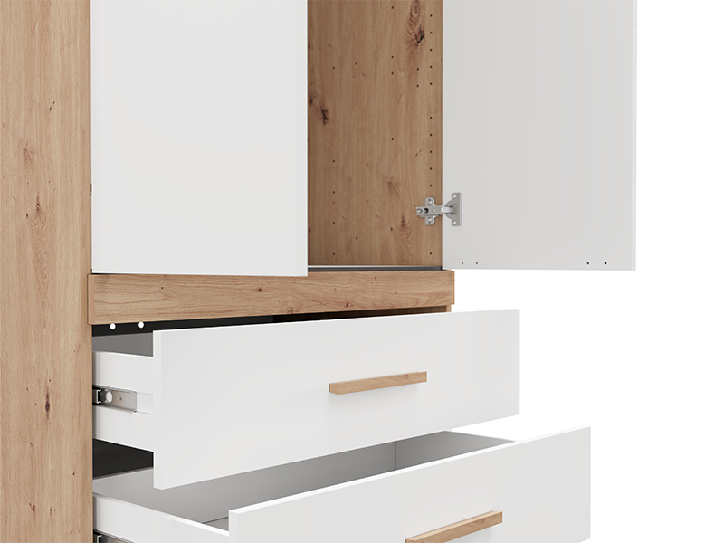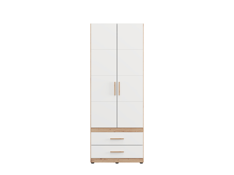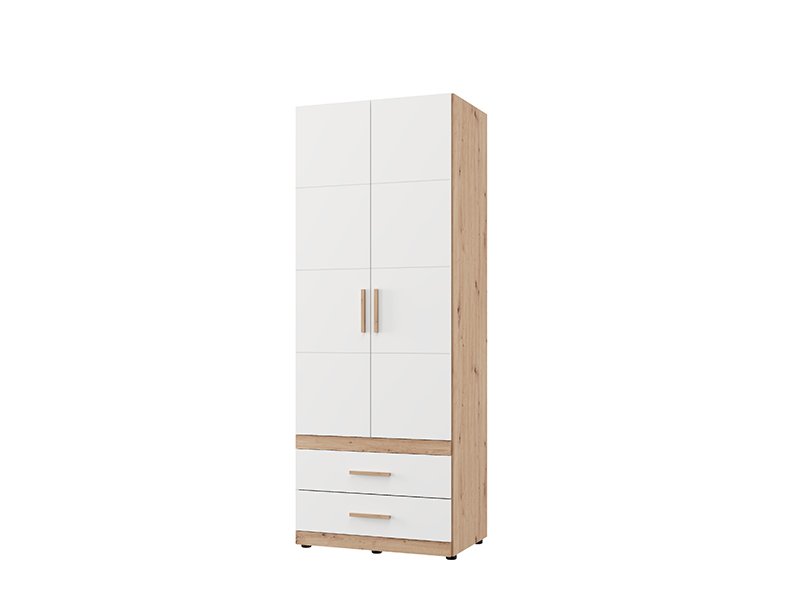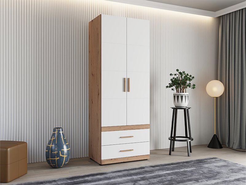 Шкаф DILLON 2K2F h207, выполненный в комбинации декора ремесленного дуба и матового белого декора, представляет собой функциональное и элегантное решение для организации одежды. Полезное пространство включает двустворчатую часть с гардеробной штангой, под которой расположены две просторные ящика. Ручки, согласованные с декором ремесленного дуба, дополнительно подчёркивают целостность и гармоничный внешний вид всего шкафа.