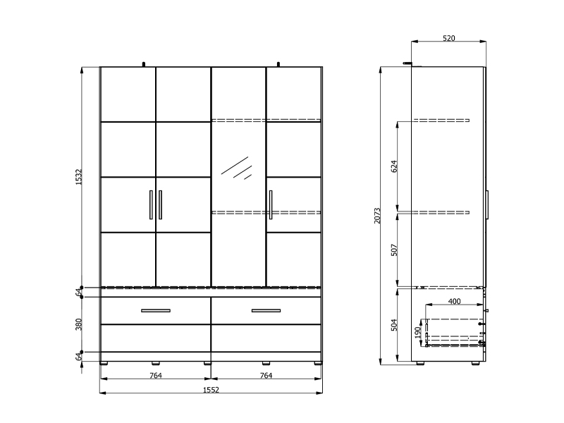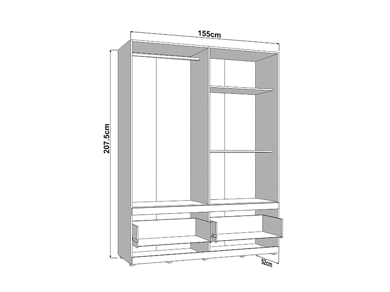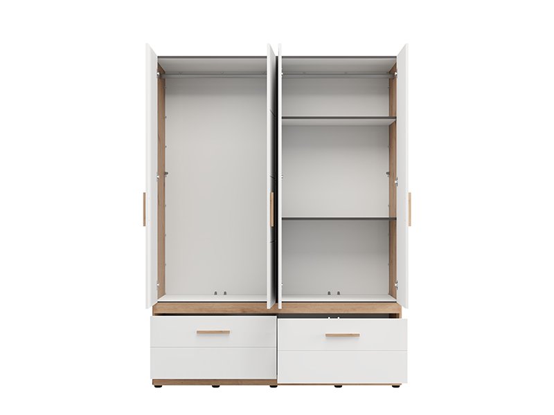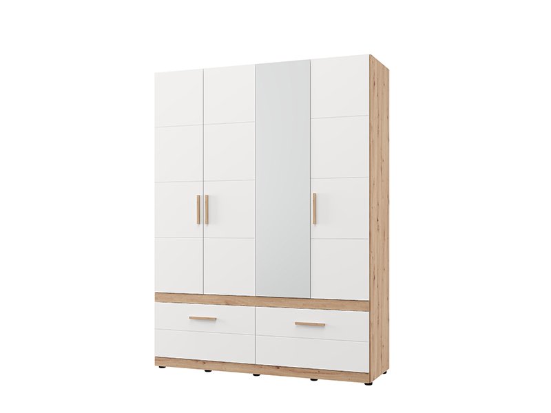Шкаф DILLON 4K2F1O h207, выполненный в комбинации декора ремесленного дуба и матового белого декора, представляет собой функциональное и элегантное решение для организации одежды. Полезное пространство состоит из двух двустворчатых частей: одна часть оснащена гардеробной штангой, а другая - перегородками. Под закрытыми секциями расположены два глубоких и просторных ящика, что обеспечивает наглядную и практичную организацию одежды и аксессуаров. На одной двери расположено зеркало, которое повышает практичность и эстетическое восприятие пространства. Полезное пространство может быть дополнительно расширено за счёт добавления комплекта полок для ещё большей функциональности.