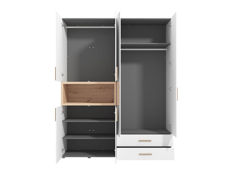 Шкаф DONALD 4K2F1O h227 в комбинации белого декора, декора артезанского дуба и фольги артезанского дуба является частью коллекции шкафов DONALD. Рабочее пространство этого четырехдверного шкафа состоит из двух частей с вешалкой, двух закрытых перегородок, двух ящиков и одной открытой полки. Эта модель шкафа также оснащена зеркалом, что улучшает как его функциональность, так и эстетику интерьера, делая его отличным выбором для различных интерьеров в современном доме. Шкаф имеет возможность установки дополнительного освещения.