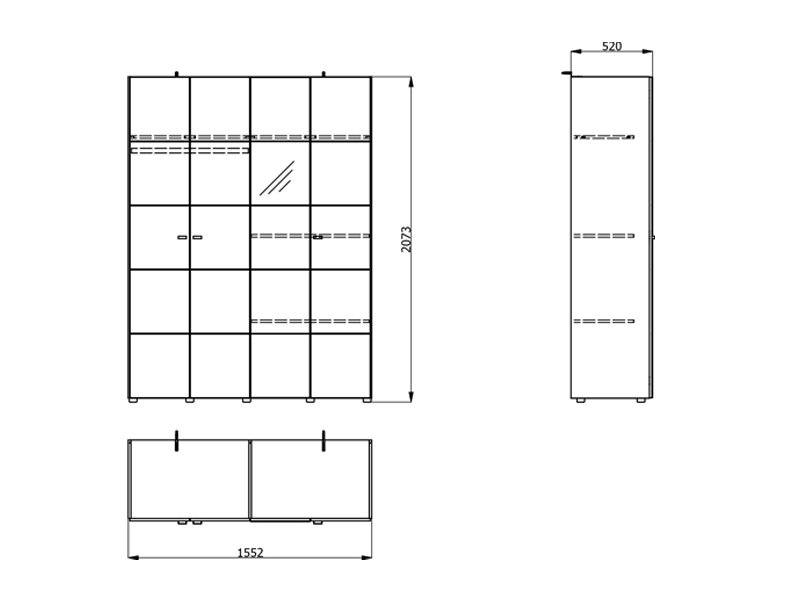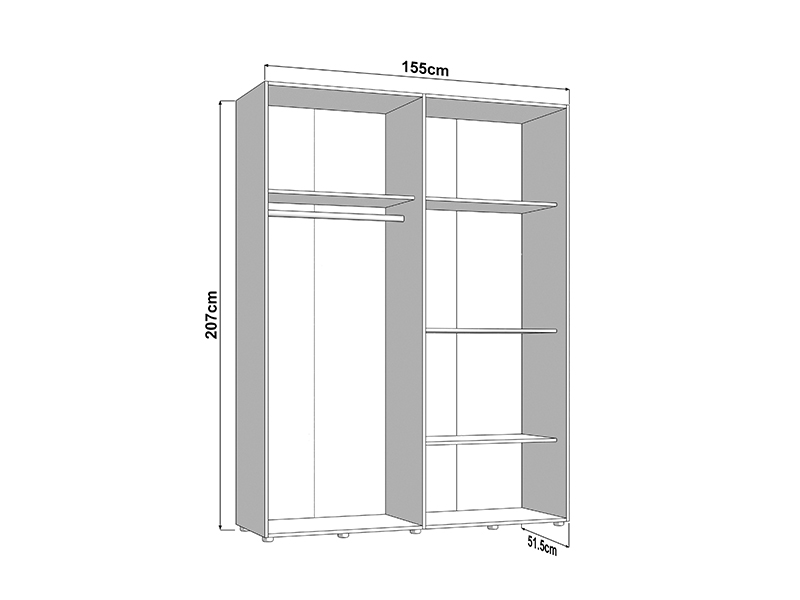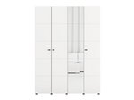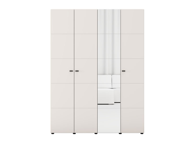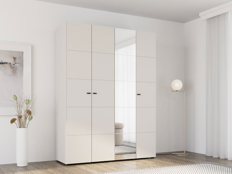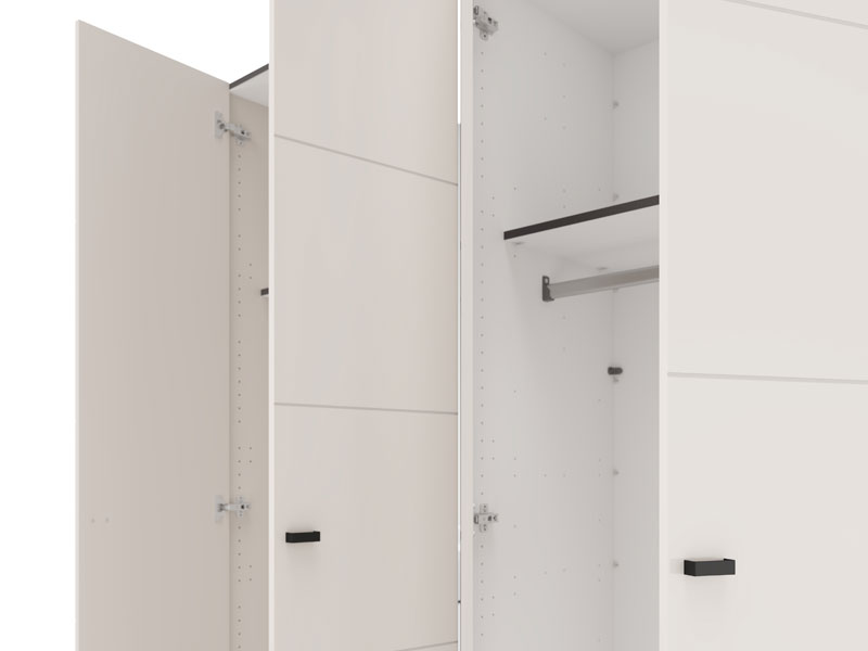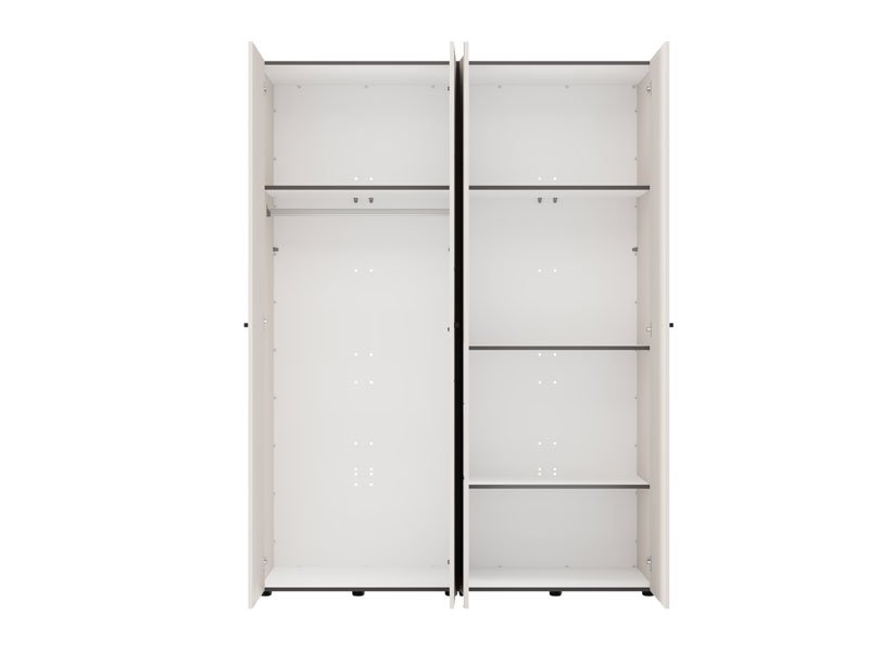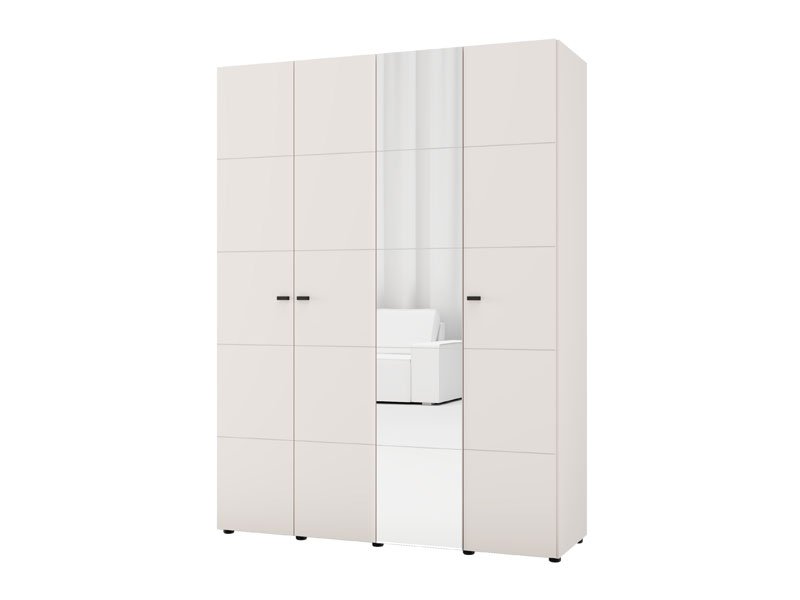 В базовой комплектации полезное пространство четырёхстворчатого шкафа организовано следующим образом - один двустворчатый модуль оснащён штангой для одежды, а второй двустворчатый модуль оборудован полками, что обеспечивает наглядное и удобное хранение гардероба и аксессуаров. Предусмотрена возможность последующей установки комплекта полок для ещё более гибкой адаптации и организации внутреннего пространства.