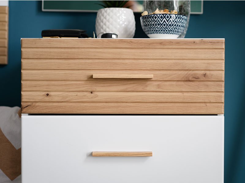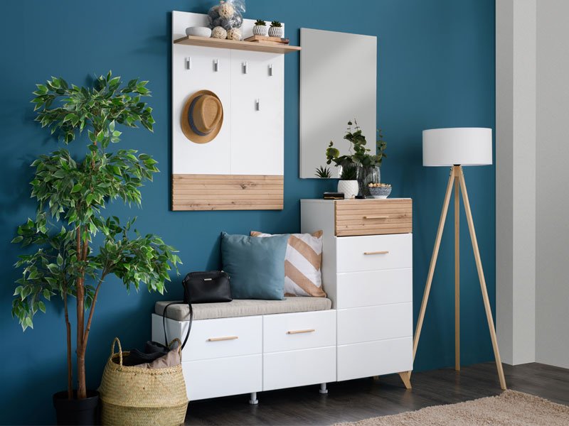 Прихожая SEIN в сочетании чисто белого цвета, декора ремесленного дуба, белой лаковой пленки и пленки цвета ремесленного дуба состоит из двух практичных частей, которые помогут вам удобно хранить любимую обувь и одежду. Верхняя часть, которая навешивается на стену, содержит крючки и практичную полку, а в нижней части имеется удобный ящик и закрытый сегмент с полками, предназначенными для размещения обуви.