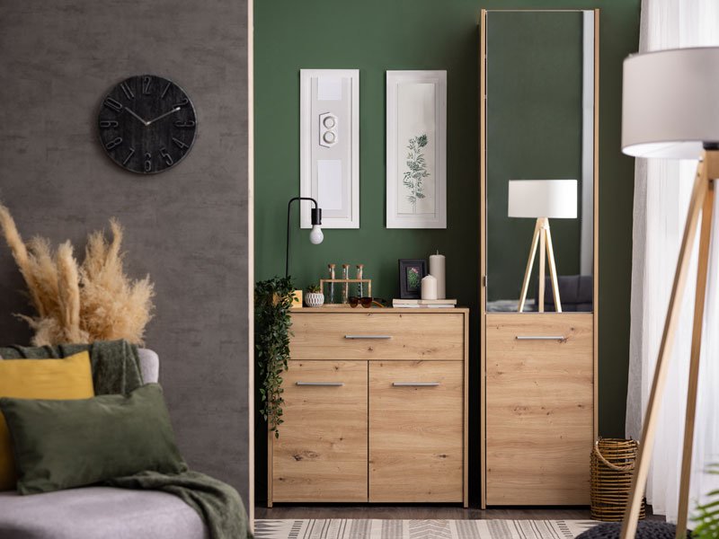 Модель шкафчика для обуви MENORICA 1K OG в декоре дуба артизан дополнена практичным зеркалом в верхней части элемента. Во внутреннем отделе находятся закрытые полки для хранения обуви, дающие возможность рационально организовать прихожую.