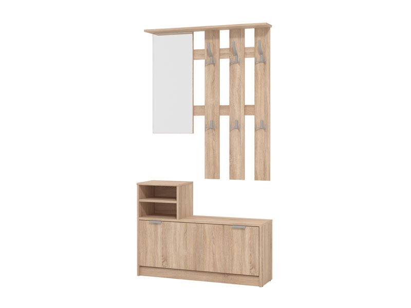 Прихожая RAVENNA состоит из двух частей: верхняя часть, которая фиксируется на стене, имеет крючки и зеркало; а нижняя часть закрытого типа служит для хранения обуви.